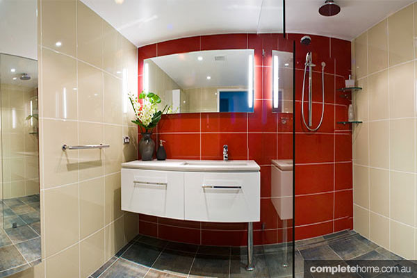 7. In a clever use of space, this guest bathroom was created from an old linen press. The red roof and panel add warm accents and the wall-to-wall mirror makes the room seem larger than it is.