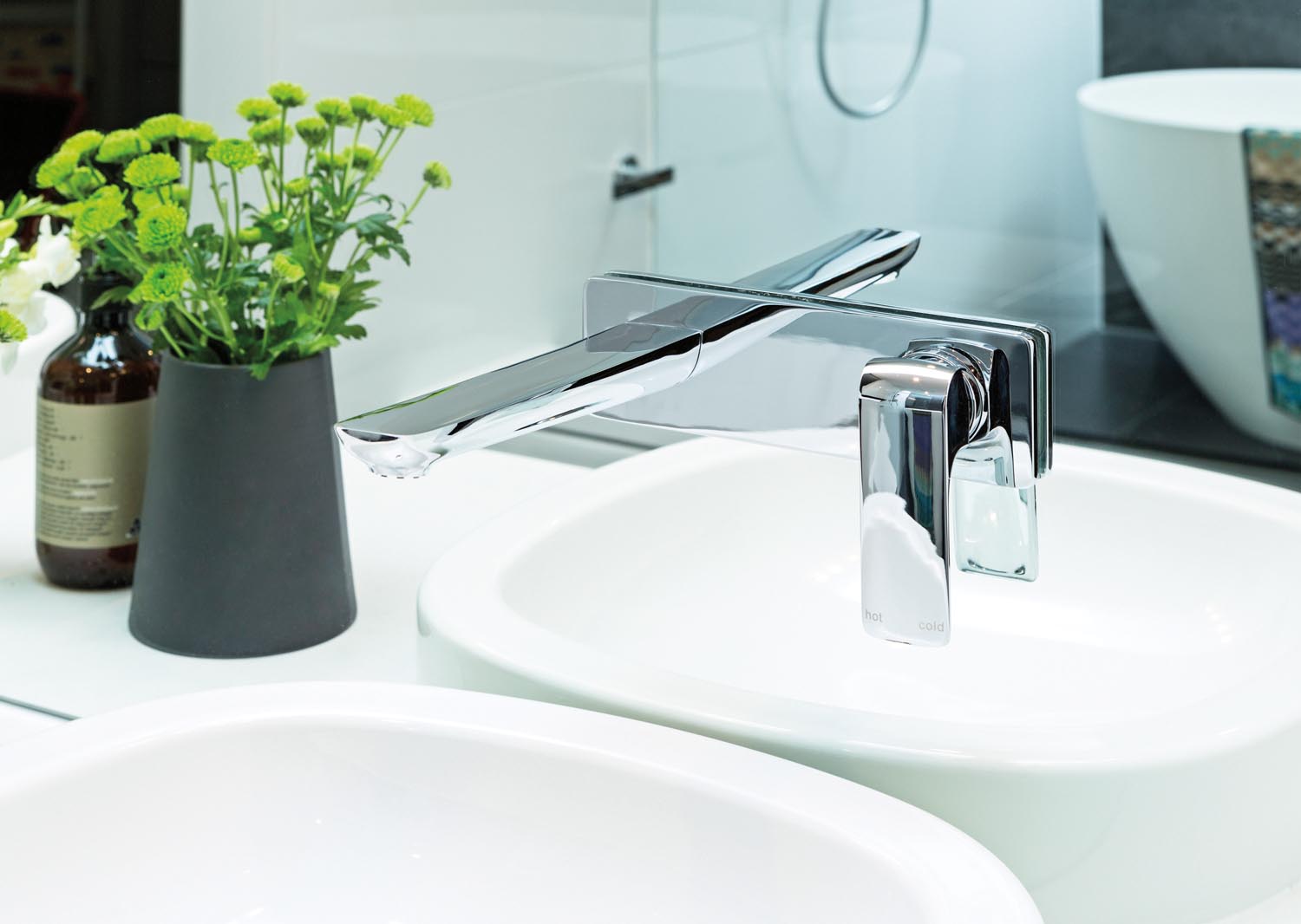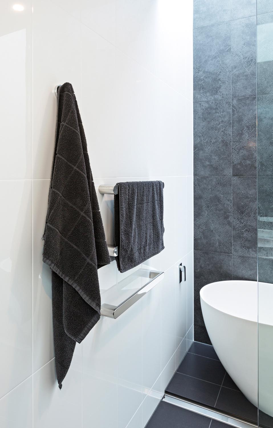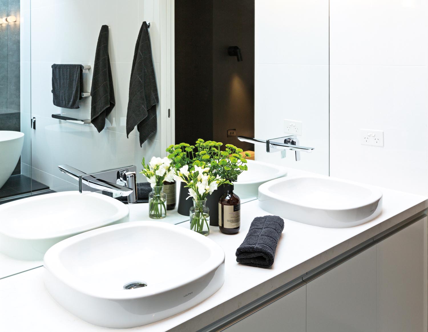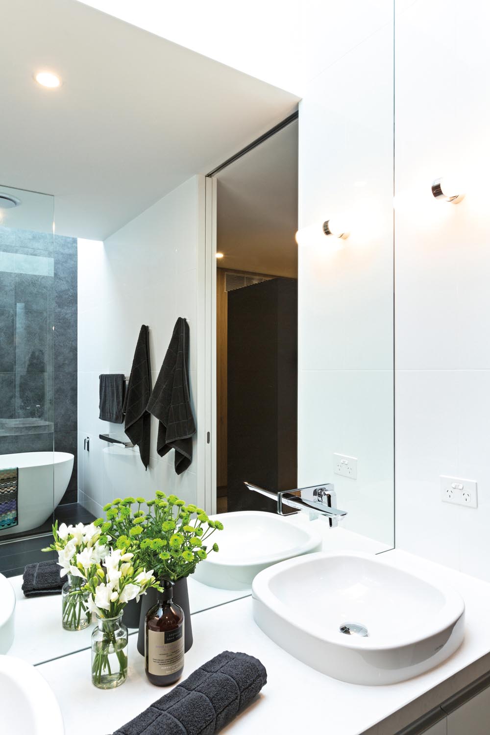 The beauty of this space is also highlighted in the deluxe tiled feature wall that reaches to the skylight — a striking design feature of the room. The glossy white double basins brighten the neutral palette and a large mirror opens the area completely. Opulent underfloor heating completes this bathroom of light and luxury.