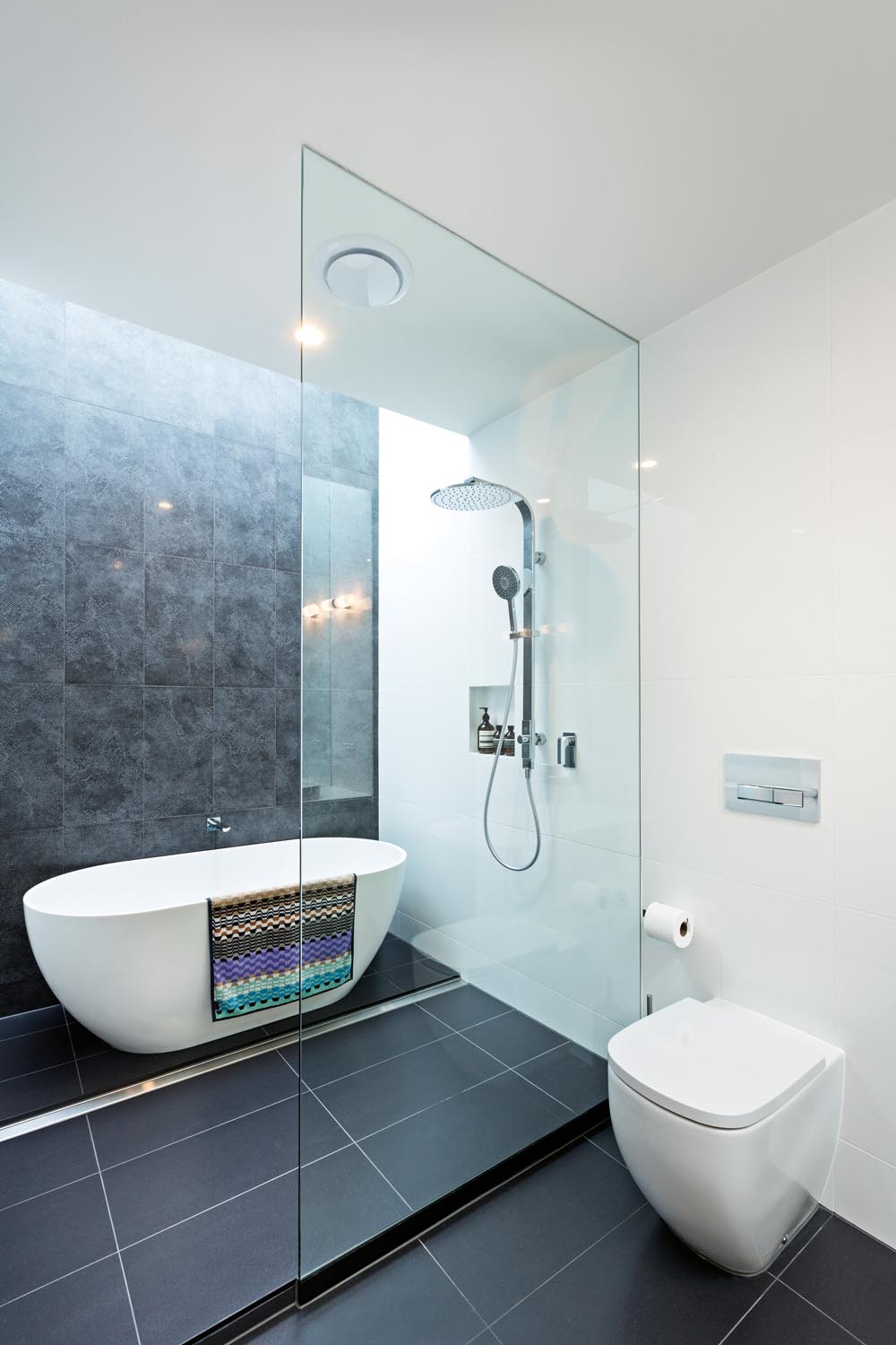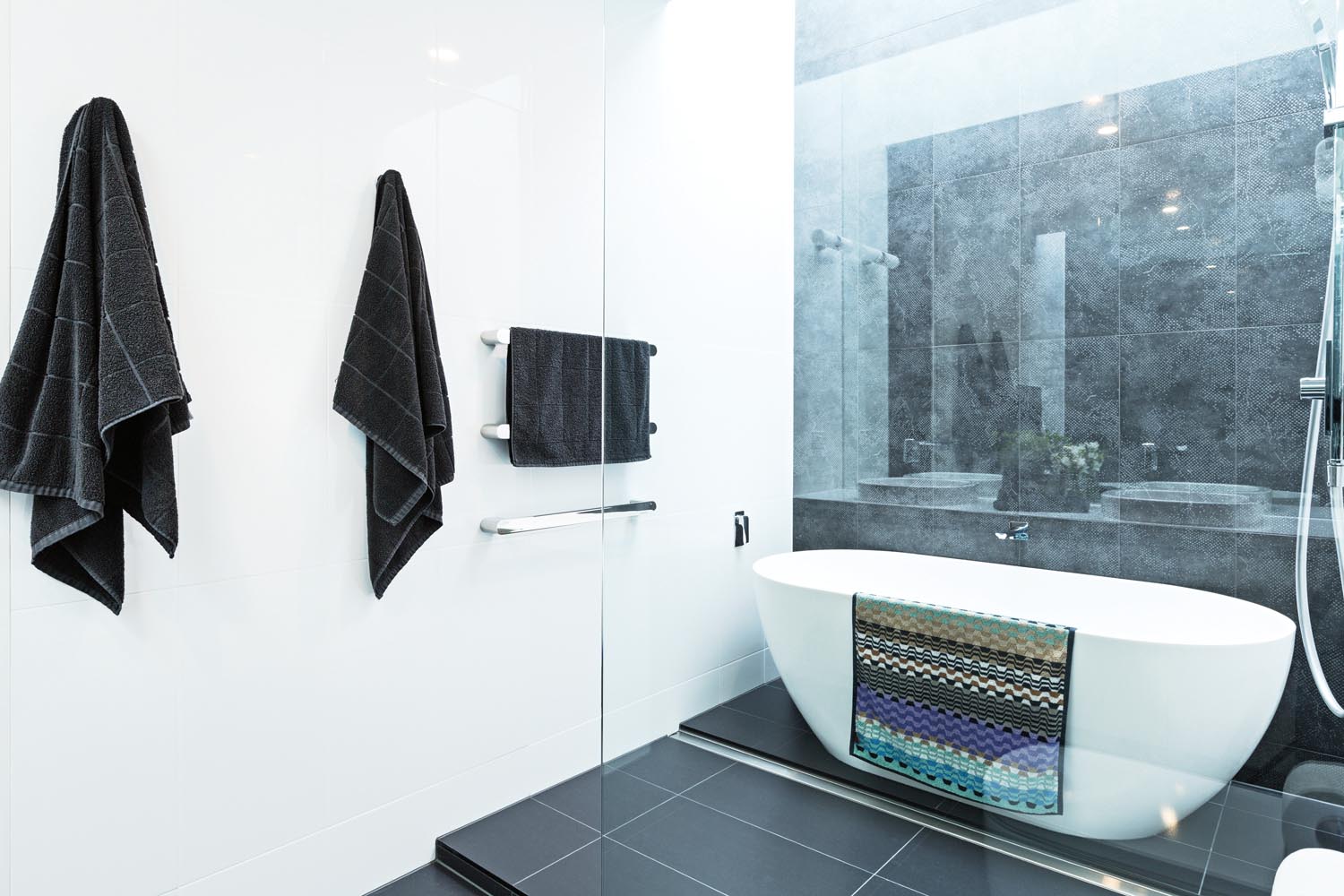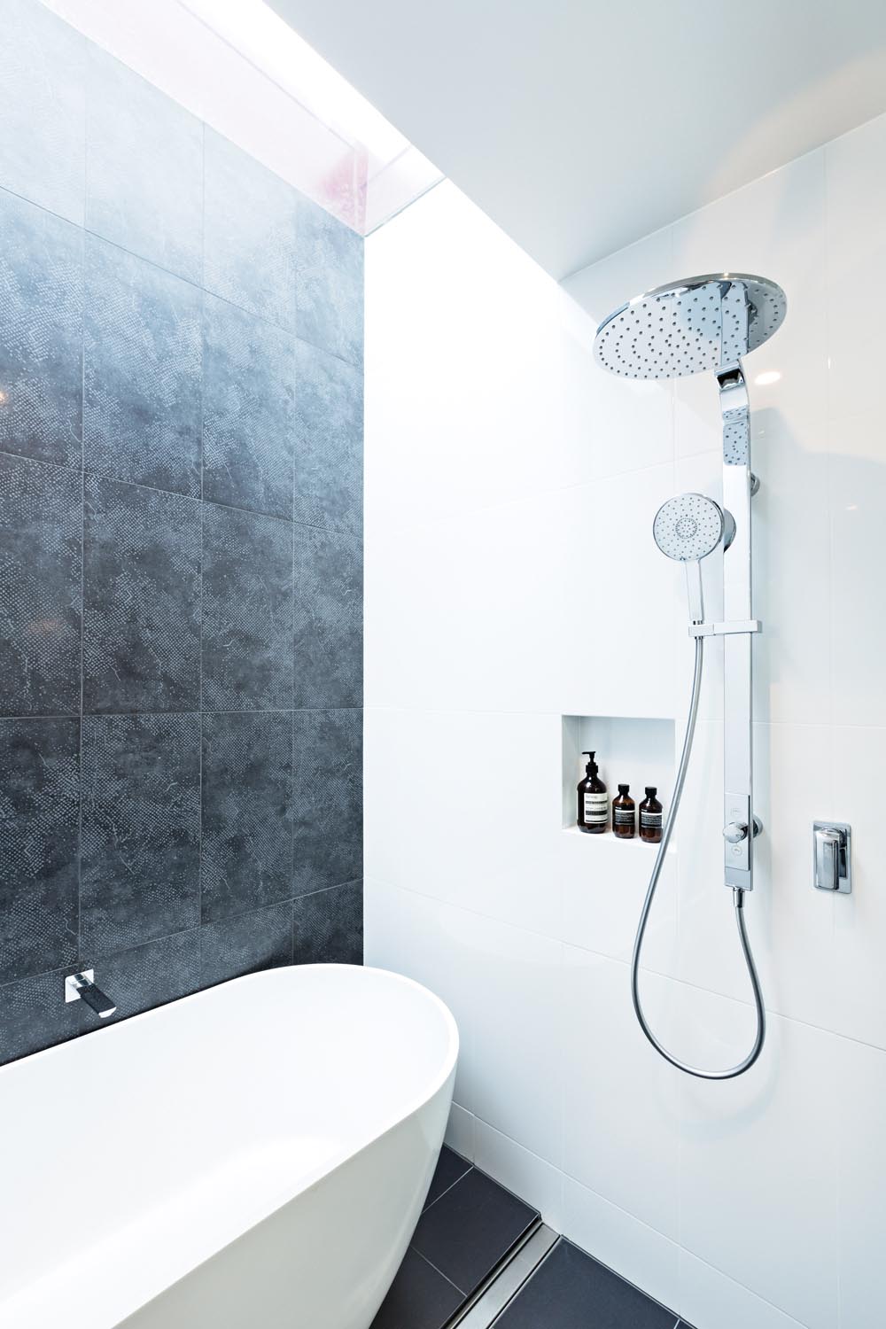 The owners wanted a wet-area-style space that brought in lots of natural light and was a relaxing haven. Two skylights at either end of the bathroom were installed to let in natural light, placing one directly above the bath to create the luxurious experience of seeing the sky while bathing. The freestanding bath was placed on a raised platform in an open, wet-style shower that is easy to use and has a clever recessed niche for storage.