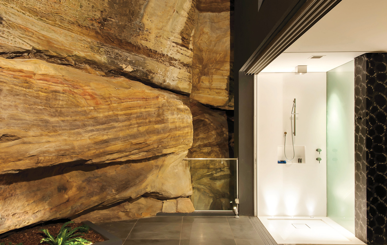 A cliff forms the stunning backdrop to the ensuite of this parents’ retreat so the finishes chosen had to complement, rather than compete with, the work of nature. The design flexibility and solid, smooth, seamless finish of Corian made it the perfect choice for the floor and wall panels in the shower and toilet cubicles. Corian Glacier White is striking in its simplicity and the enhanced translucency of the colour helps reflect lighting.