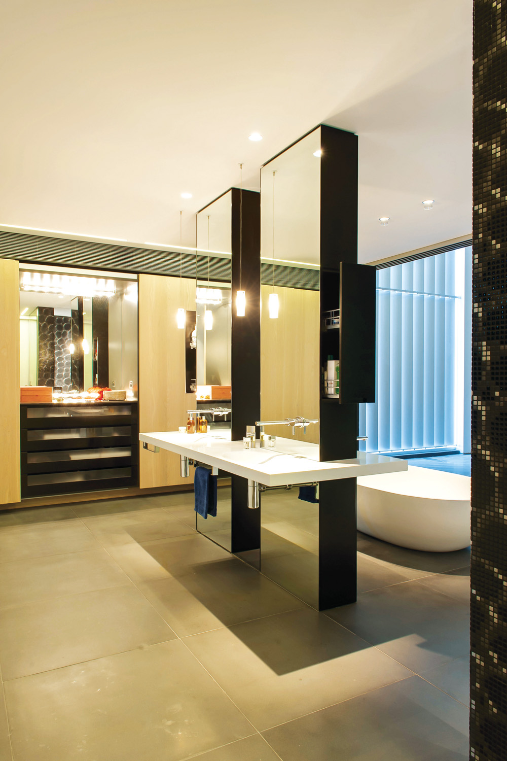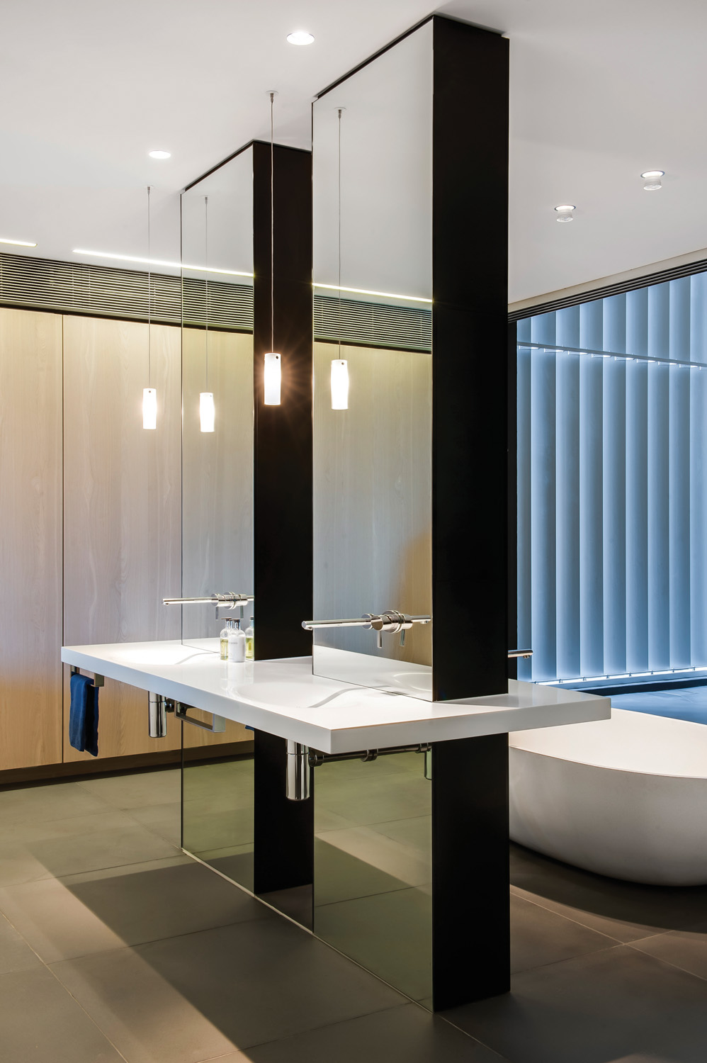 As Corian can be thermoformed to create various 2D and 3D designs, Minosa custom designed the scooped double washbasin and vanity top entirely out of this material. It appears to float as it intersects with the structural piers covered in mirror. Together with the large free-standing bath, it adds an organic shape and sculptural element to the modern and very streamlined design of the entire space.
