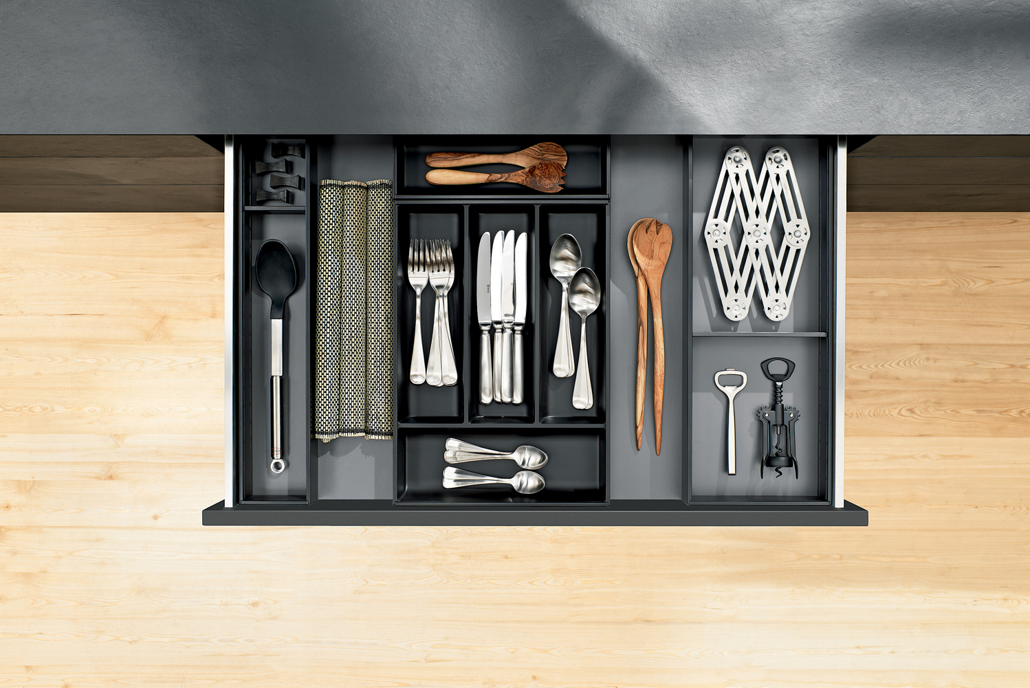 No one likes a messy drawer. By combining LEGRABOX drawers with Blum’s AMBIA-LINE inner dividing system, your drawers will enjoy a sophisticated aesthetic, both inside and out. AMBIA-LINE can be easily reconfigured to suit your needs, using magnetic frames that attach to each other as well as the metal drawer sides of LEGRABOX for a snug fit every time.