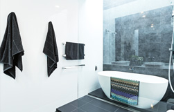 The freestanding bath was placed on a raised platform in an open, wet-style shower that is easy to use and has a clever recessed niche for storage. The beauty of this space is also highlighted through the deluxe tiled feature wall that reaches to the skylight, a striking design feature of the room. The glossy white double basins brighten the neutral palette and a large mirror opens the area completely. Opulent underfloor heating completes this bathroom of light and luxury.”