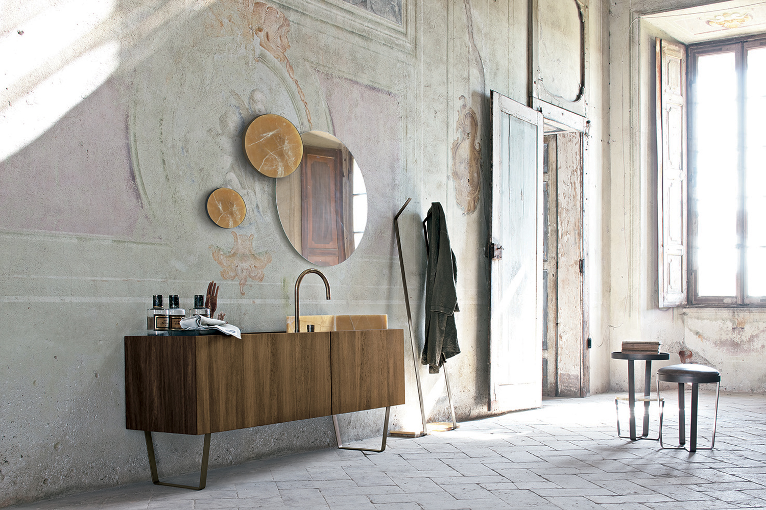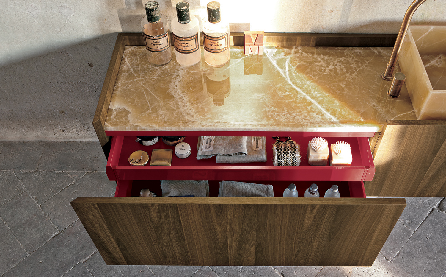 This bathroom collection utilises the latest and most cutting edge materials, including Kerlite, Fenix, Koral, varnished glass cladding and even slabs of parquet flooring as door fronts. The 360Gradi features a 45 degree mitred door edge for a seemless handless finish.