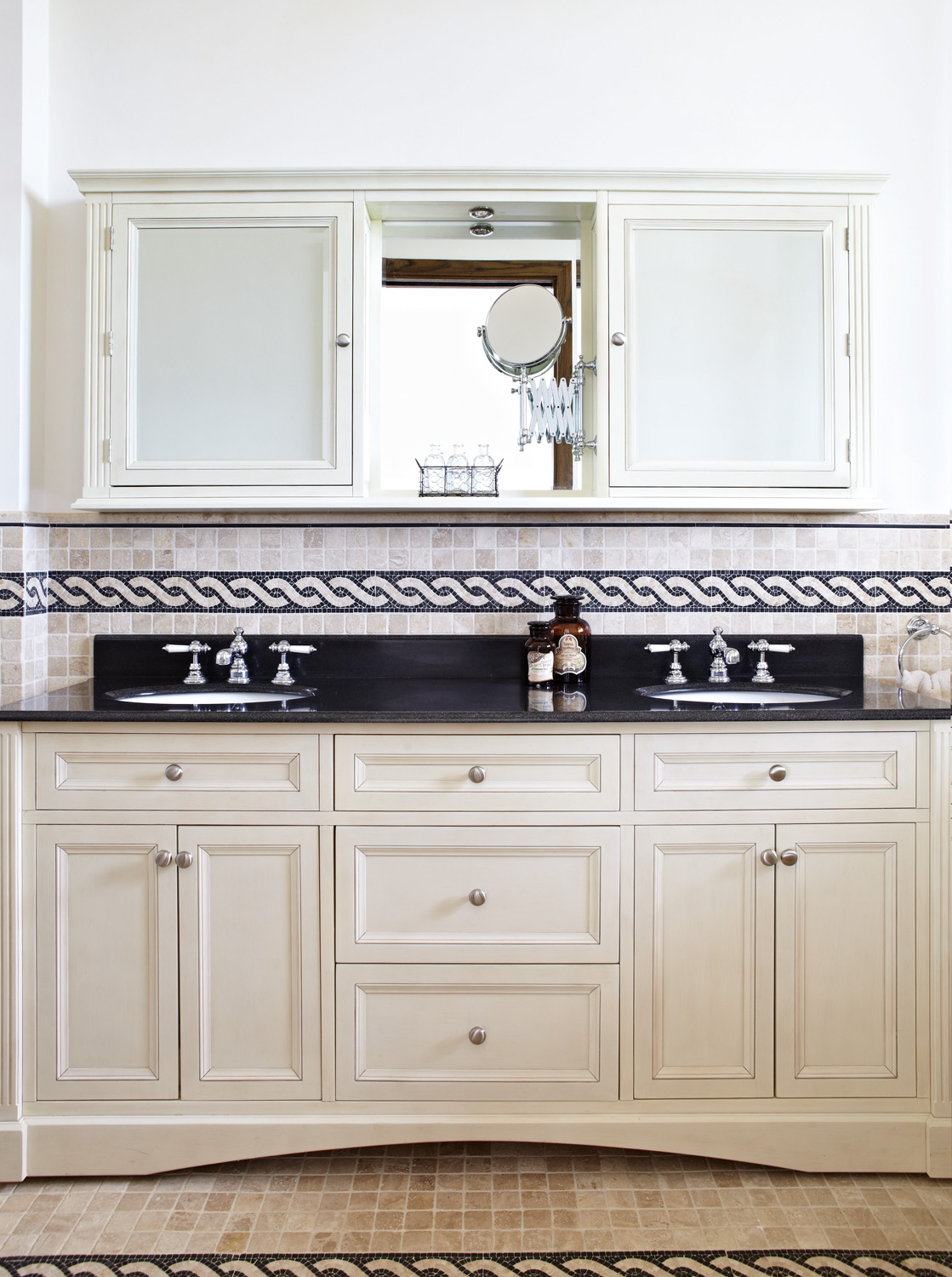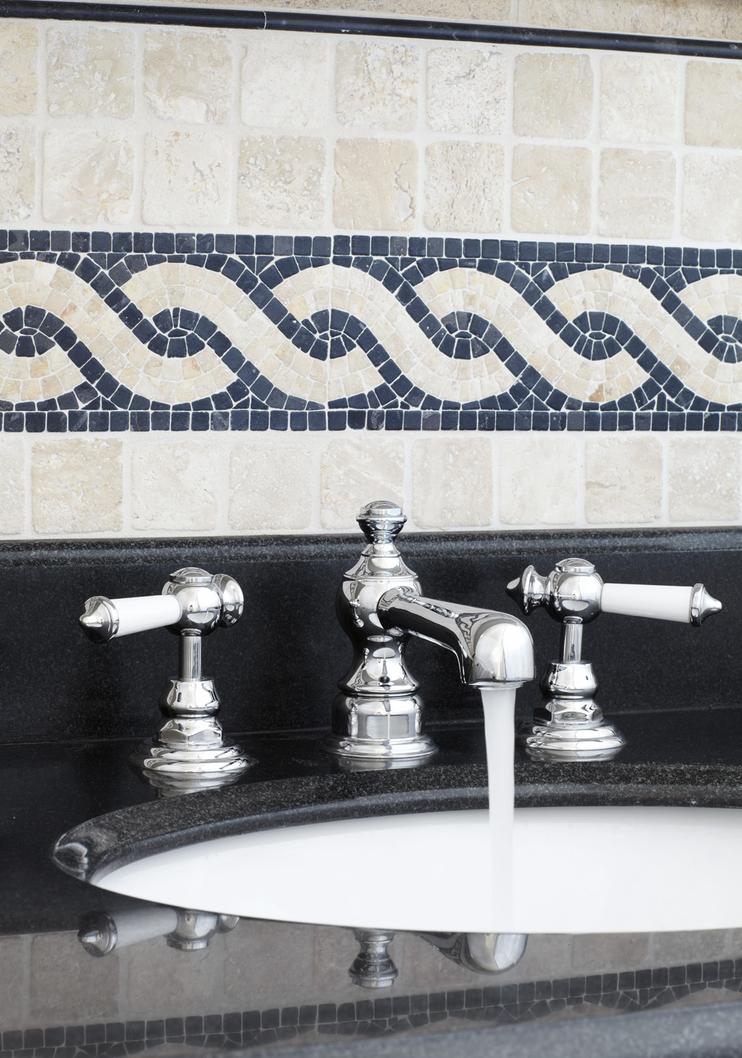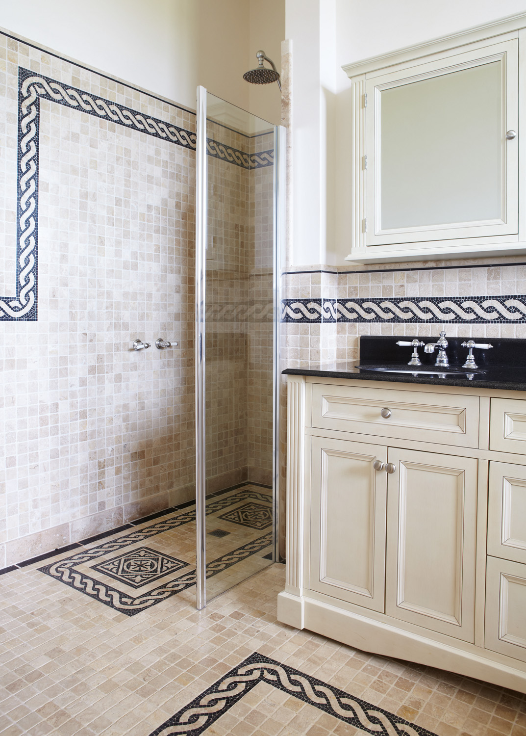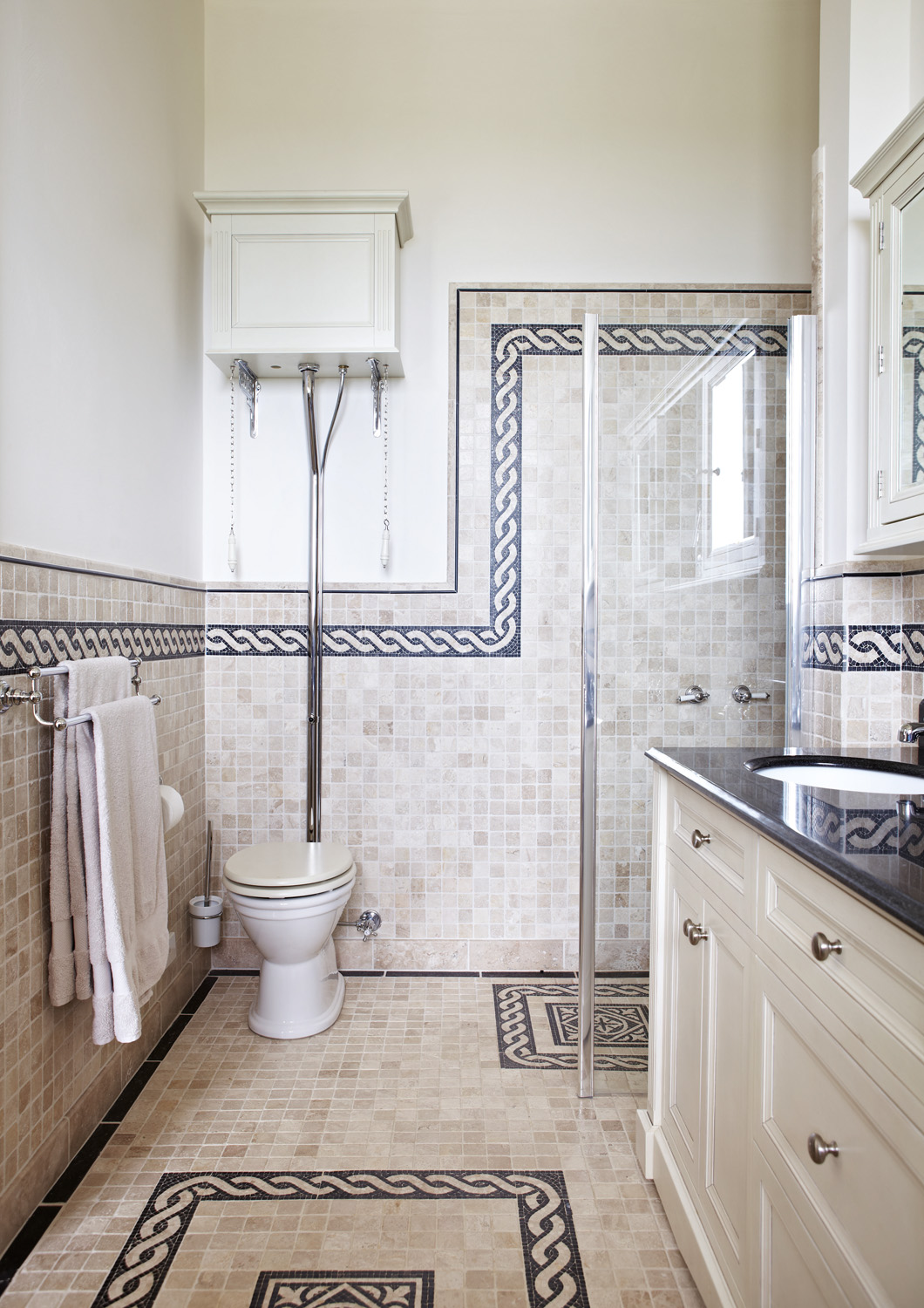 “This authentic recreation of a Federation-style bathroom showcases the beautiful decoration and detail of that era, a classic look that is still extremely popular in modern homes. Tiling is very much an art form of the period, with precise placement of dark feature tiles in the main space and shower recess, along with pencil and border tiles against a neutral backdrop of creamy travertine and limestone mosaics. Old-school workmanship is highlighted in the detail of the vanity cupboards and mirrored medicine cabinet, which is continued in the toilet suite. Accessories such as the lever tap sets in lifetime chrome finish and the black granite vanity top and splashback add vintage style and substance.”