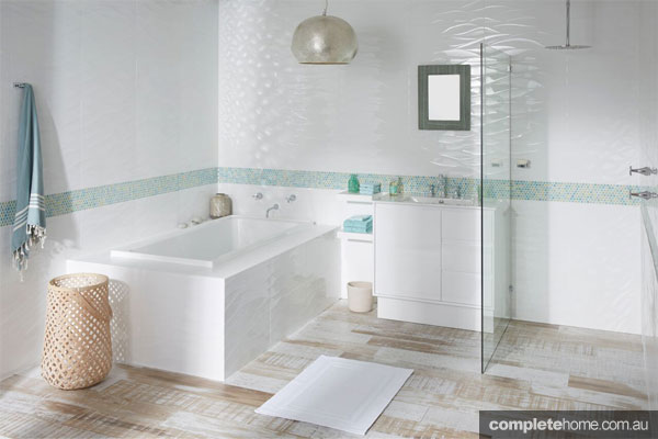 The perception of space has been maximised by using white wall tiles, continued across the front of the bath, and a sleek white vanity. The look has then been softened with the use of texture on the wall tiles and a beautifully distressed timber tile on the floor.