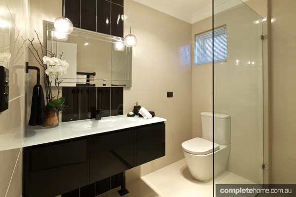 “I have worked with my interior designer, Agatha Ozhylovski, on a number of renovations in the past. With her expertise and guidance, we have transformed this bathroom into a modern interior with a masculine sensibility to suit my brief. The restrictive size of the bathroom meant it was important to eliminate clutter. We moved the doorway and removed the bath to make way for a large shower. The new shower channel allowed us to use the existing water outlet, which saved on plumbing costs. The design incorporates black fittings, which appealed to my desire for a bathroom that was a little out of the ordinary. The wall-hung vanity unit makes a dramatic statement and is complemented by the custom-made mirror and black feature tiles. The pendant lights create a lightness of touch to the overall design while the large tiles add a sense of luxury and elegance.”