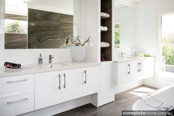 “After many years designing and building high-end homes, we understand that spacious bathrooms exude a sense of elegant luxury. We concealed the shower and WC behind a feature wall and softened the look with large curved cornices and large-format tiles that fold down the wall and across the floor. Their earthy texture offsets the crisp gloss white of the suspended vanities and creates a warm backdrop to the simple elegance of the curved free-standing bath. Twin vanities with white stone vanity tops feature a 40mm edge, Infinite undermount basins and square polished chrome basin mixers for a very modern look. Generous storage is further enhanced by the central display unit with internal timber veneer lining and glass shelves. We used this display nook as an opportunity to provide a tonal link with the tiles. We also find that large mirrors and ample natural light have great appeal to homeowners.”