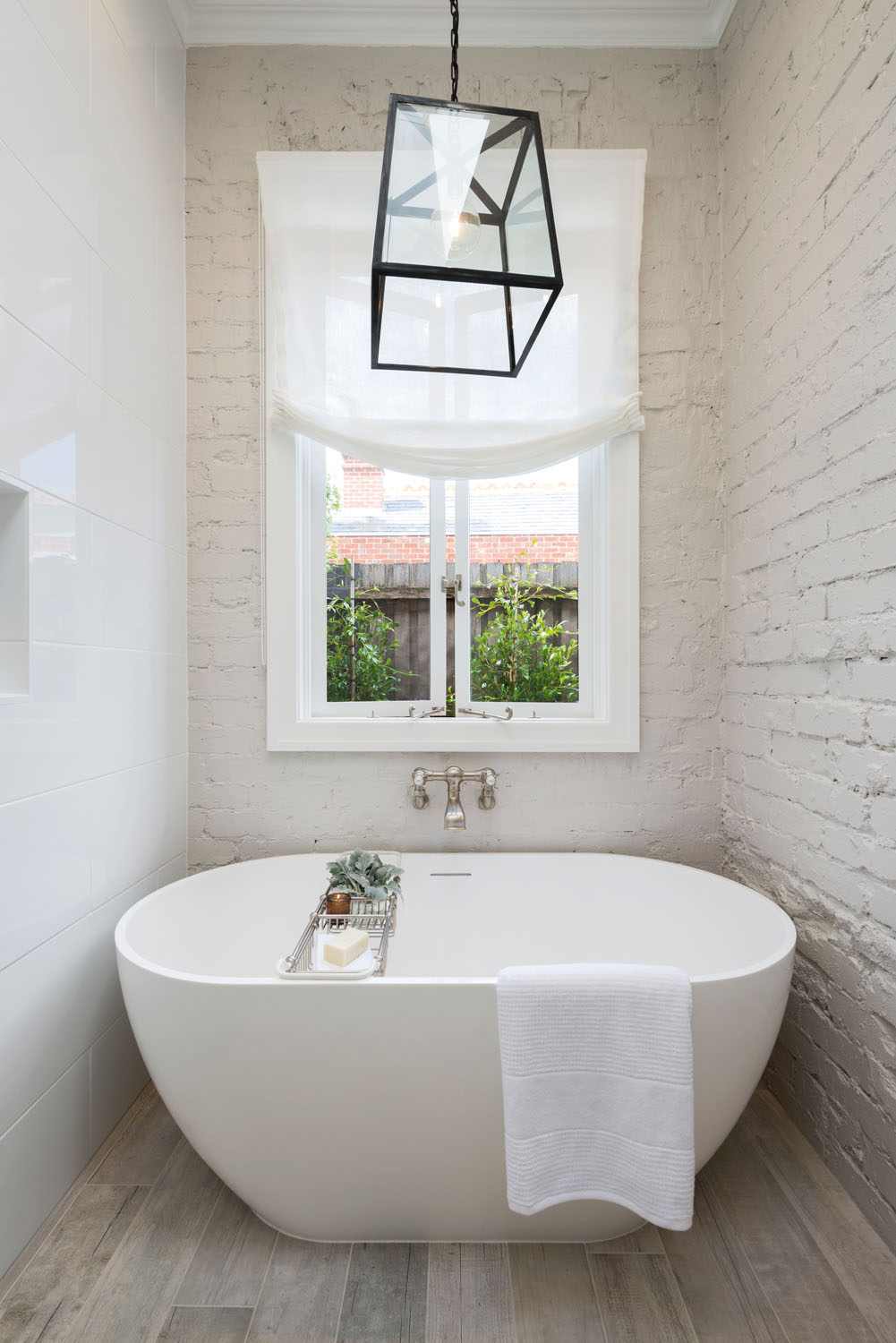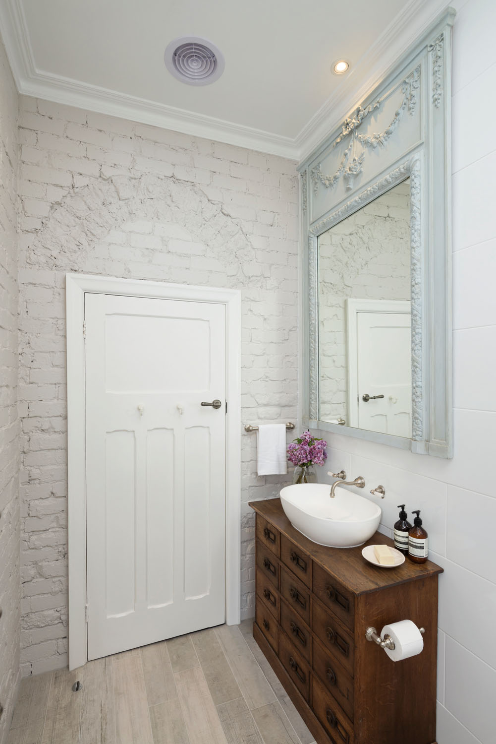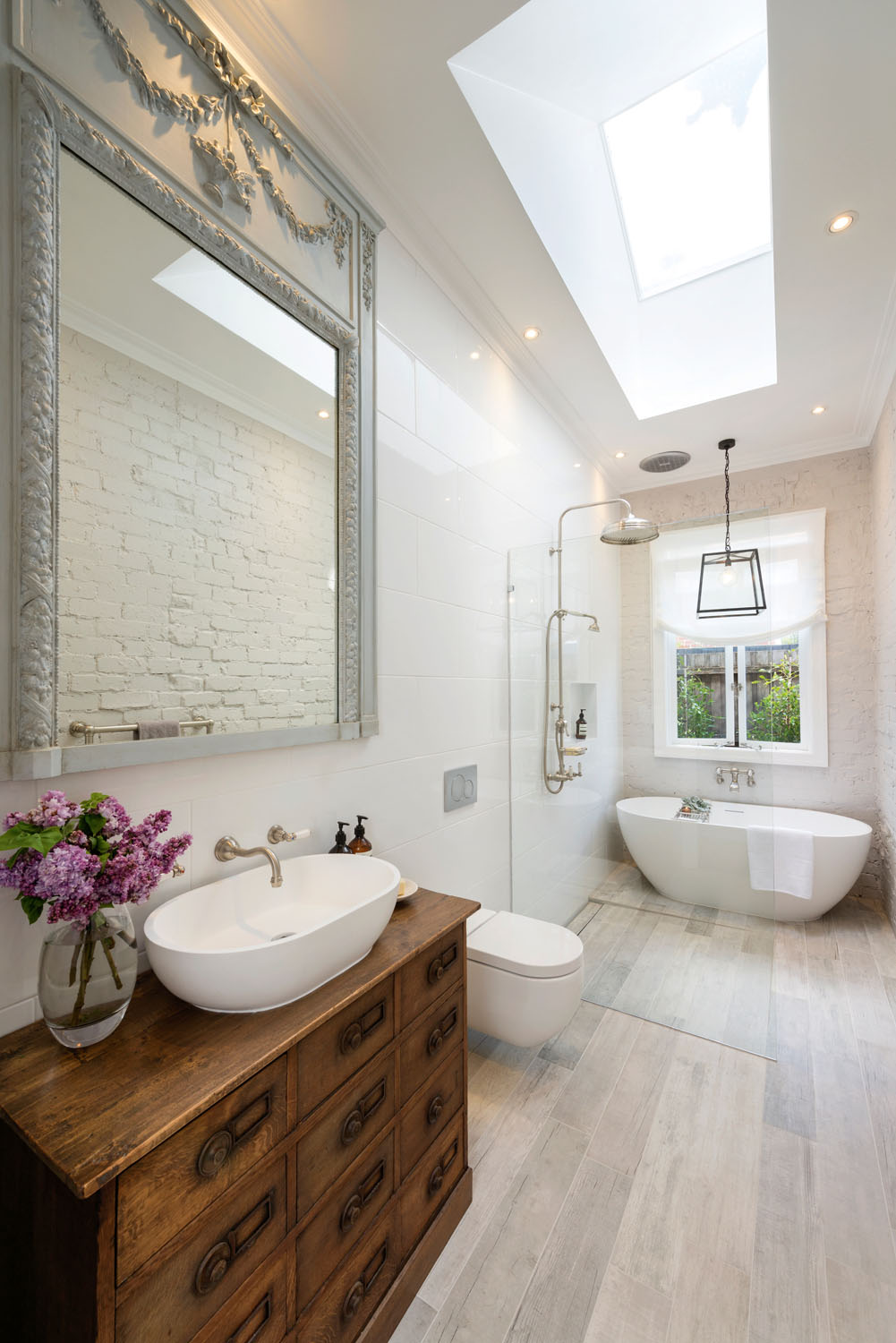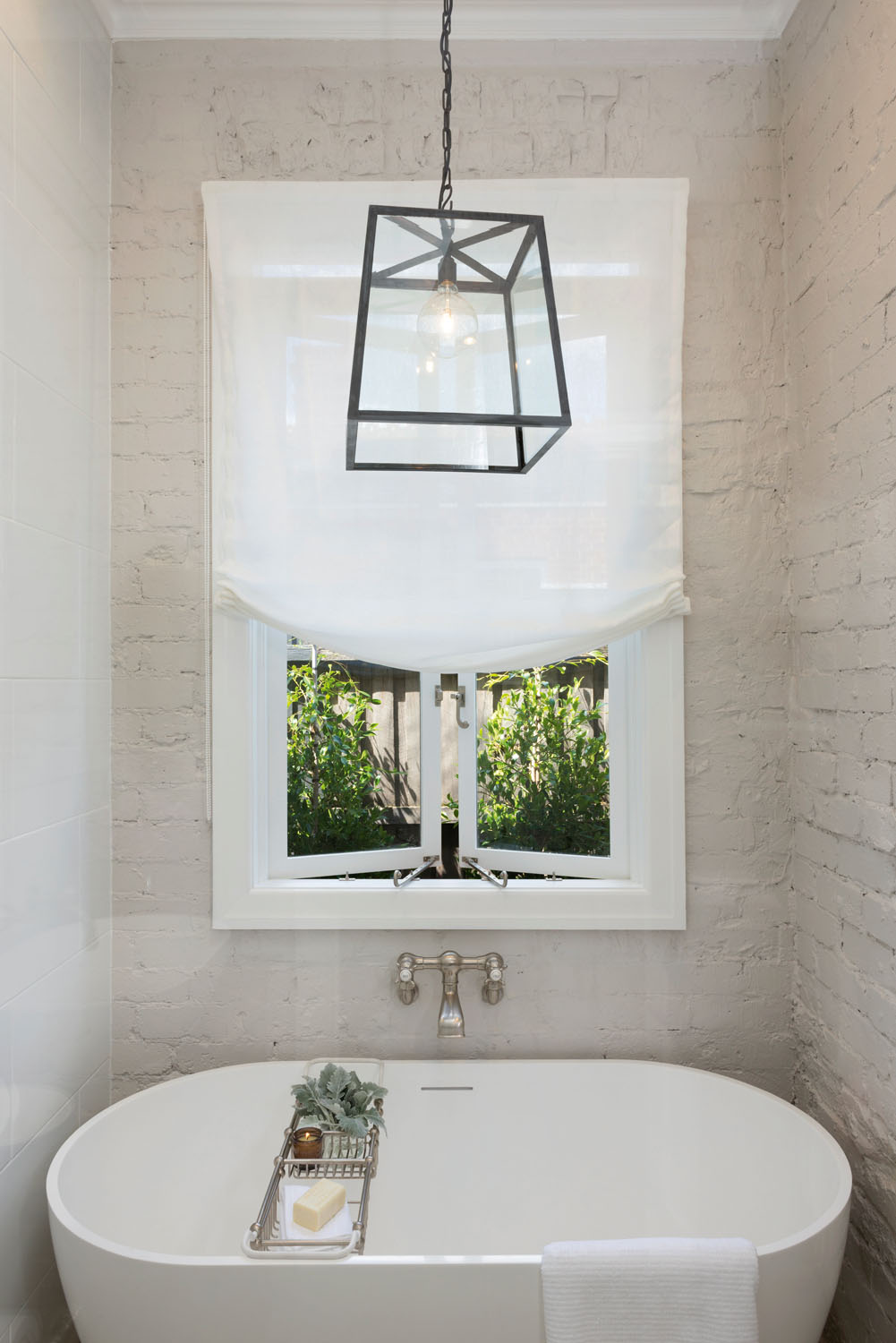 “This light-soaked bathroom forms part of a larger renovation, and the owners wanted a design that would fit with the French provincial aesthetic they’d planned for the rest of their home. A small, older-style window and a wall of mirrors dated the old space, and the client was after something new, bright and full of character. The long, narrow room provided a challenge, but a generous bath and a broad French-style window draw the eye across and help create the illusion of a larger space. Antique French pieces and exposed brick evoke the feeling of spending a weekend away at a luxurious European B&B and contrast beautifully with the modern bath, basin and lighting. The heated towel rail and shower rose promise an inviting escape in which every convenience has been carefully considered, while the generous vanity storage offers incredible practicality for the busy modern household. Tied together with beautiful pewter touches, sweeping panes of glass and charming accessories, this room is a perfect marriage of country Europe and modern Australia.”