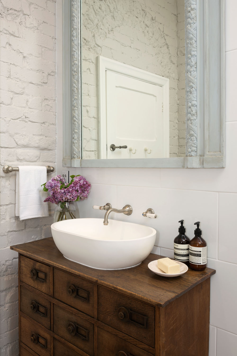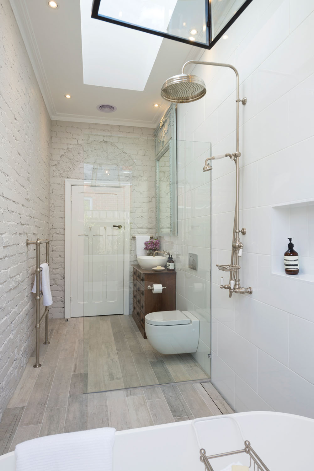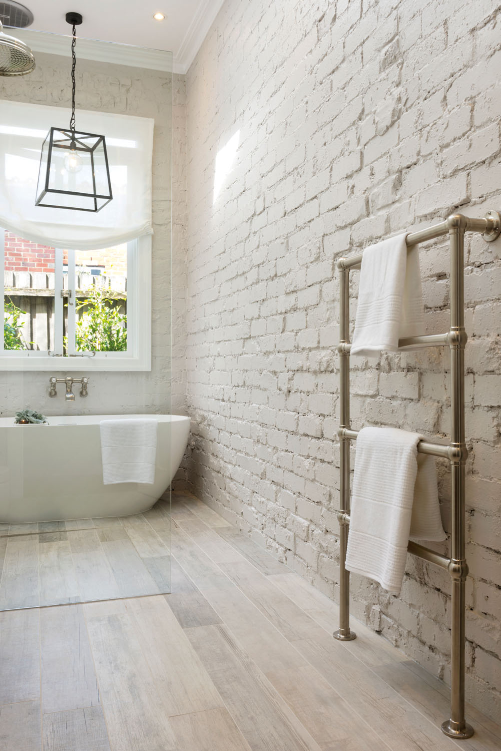 “This light-soaked bathroom forms part of a larger renovation, and the owners wanted a design that would fit with the French provincial aesthetic they’d planned for the rest of their home. A small, older-style window and a wall of mirrors dated the old space, and the client was after something new, bright and full of character. The long, narrow room provided a challenge, but a generous bath and a broad French-style window draw the eye across and help create the illusion of a larger space. Antique French pieces and exposed brick evoke the feeling of spending a weekend away at a luxurious European B&B and contrast beautifully with the modern bath, basin and lighting. The heated towel rail and shower rose promise an inviting escape in which every convenience has been carefully considered, while the generous vanity storage offers incredible practicality for the busy modern household. Tied together with beautiful pewter touches, sweeping panes of glass and charming accessories, this room is a perfect marriage of country Europe and modern Australia.”