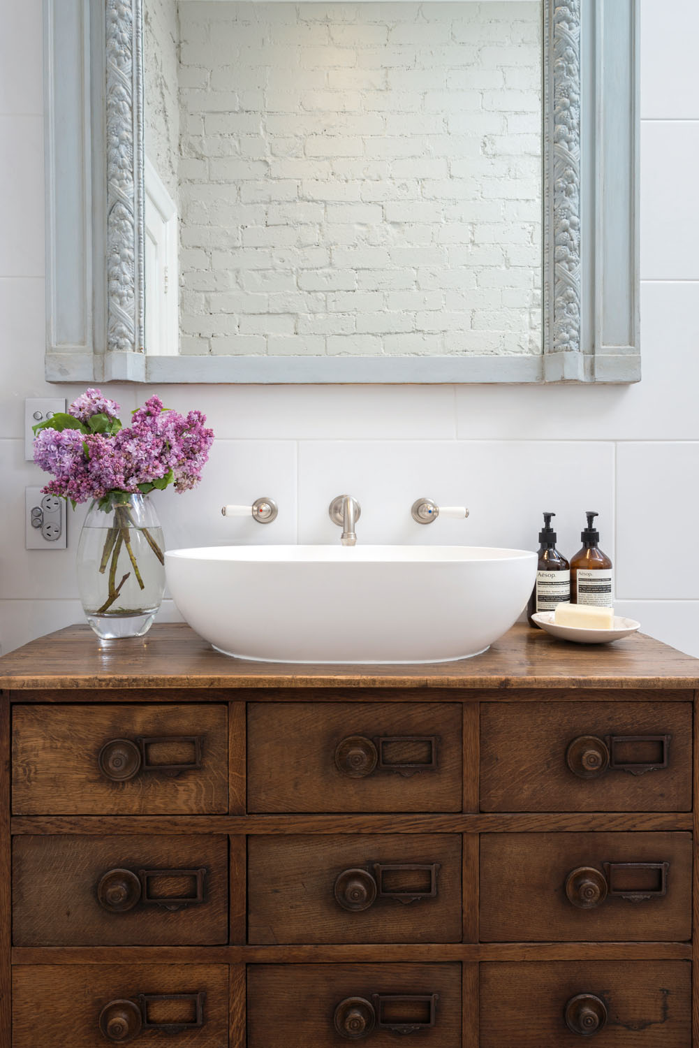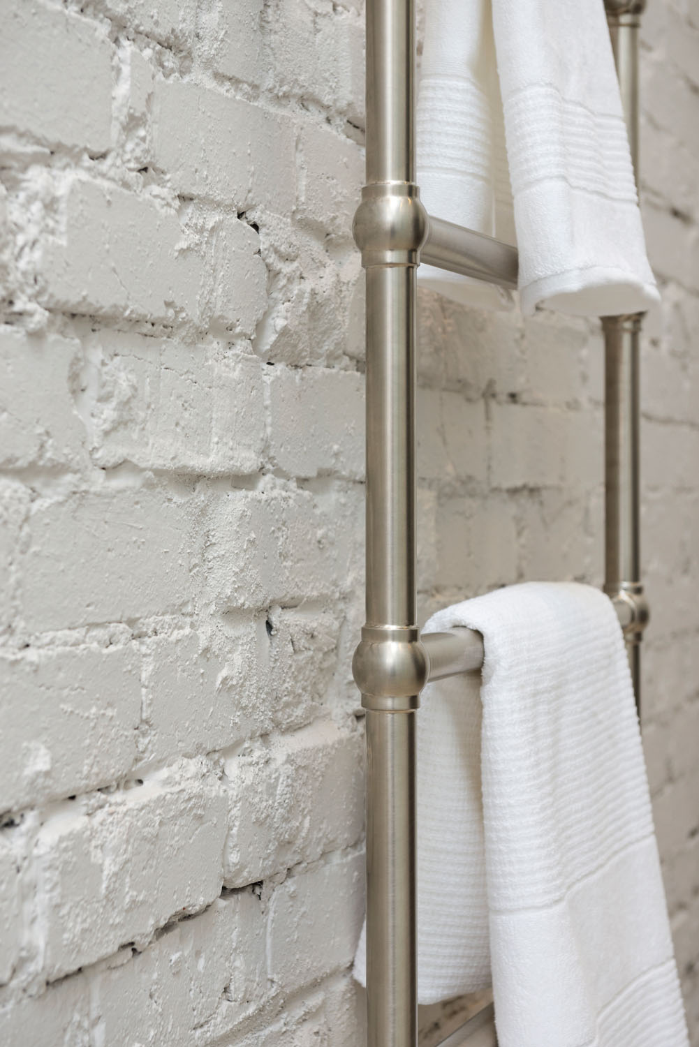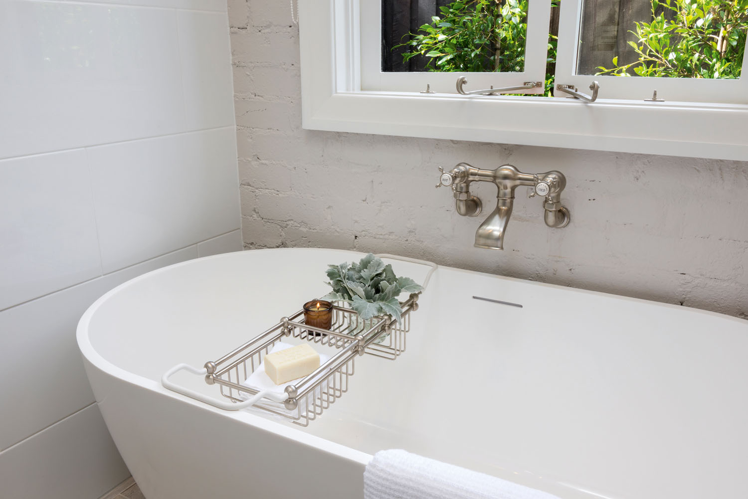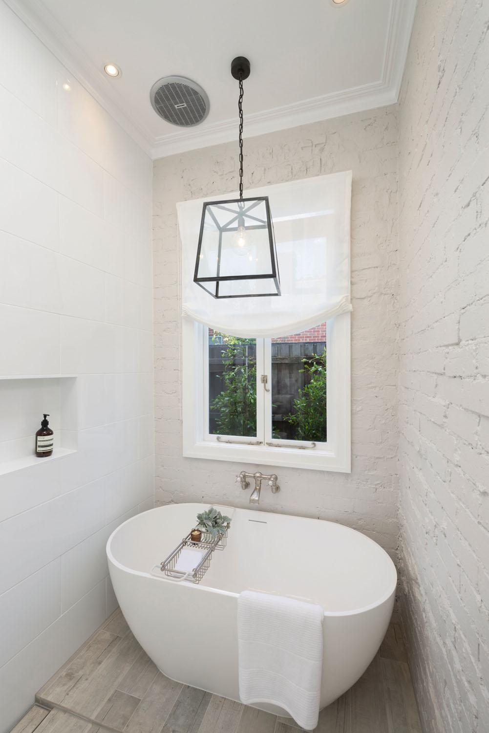 “This light-soaked bathroom forms part of a larger renovation, and the owners wanted a design that would fit with the French provincial aesthetic they’d planned for the rest of their home. A small, older-style window and a wall of mirrors dated the old space, and the client was after something new, bright and full of character. The long, narrow room provided a challenge, but a generous bath and a broad French-style window draw the eye across and help create the illusion of a larger space. Antique French pieces and exposed brick evoke the feeling of spending a weekend away at a luxurious European B&B and contrast beautifully with the modern bath, basin and lighting. The heated towel rail and shower rose promise an inviting escape in which every convenience has been carefully considered, while the generous vanity storage offers incredible practicality for the busy modern household. Tied together with beautiful pewter touches, sweeping panes of glass and charming accessories, this room is a perfect marriage of country Europe and modern Australia.”
