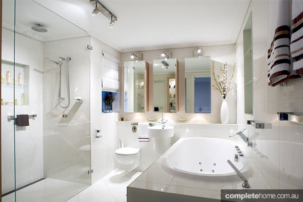 Contrasted with the timber door frame, this white and glass bathroom is perfectly contemporary. The view out to a small private courtyard is especially stylish and relaxing.