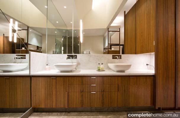 “This striking bathroom with its Gaudí-inspired sculptural ceiling and wall shapes is in a 1920s Tudor-style home with gothic details. The materials, from the Carrara marble and timber veneer of the vanity to the Portuguese limestone floor tiles, are reminiscent of the era but incorporated in the renovation in a contemporary way. The basins, wall-hung toilet and bath were all chosen for their rounded shapes, in keeping with the remodelled wall and ceiling shapes. Oversized mirrors reflect these sculptural elements of the space as well as light and space. Considering everything else going on in the space, we kept tap fittings, accessories and the glass shower panel very minimal with modern, clean lines.”