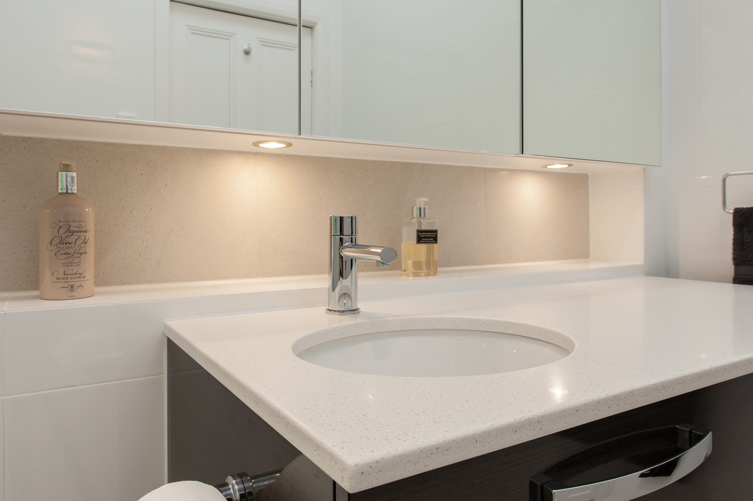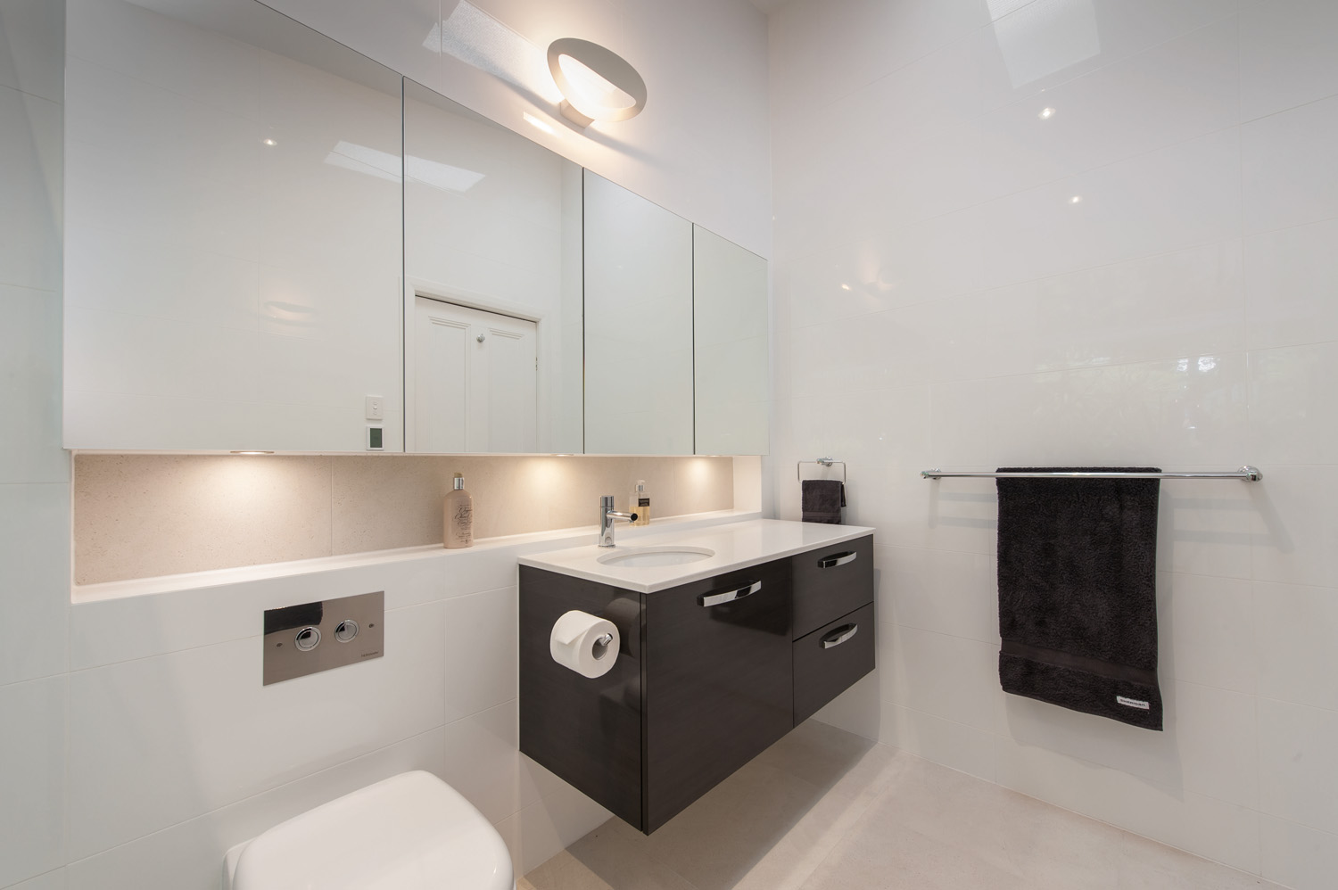 The use of a light colour palette, polished surfaces and minimalist storage and accessories beautifully highlight this contemporary bathroom design