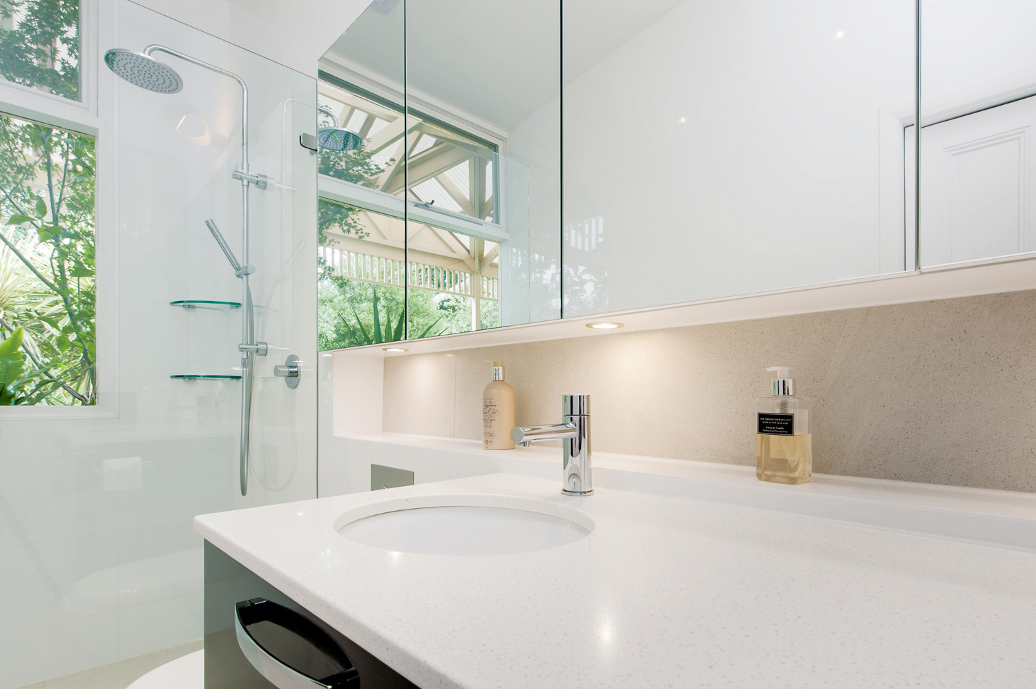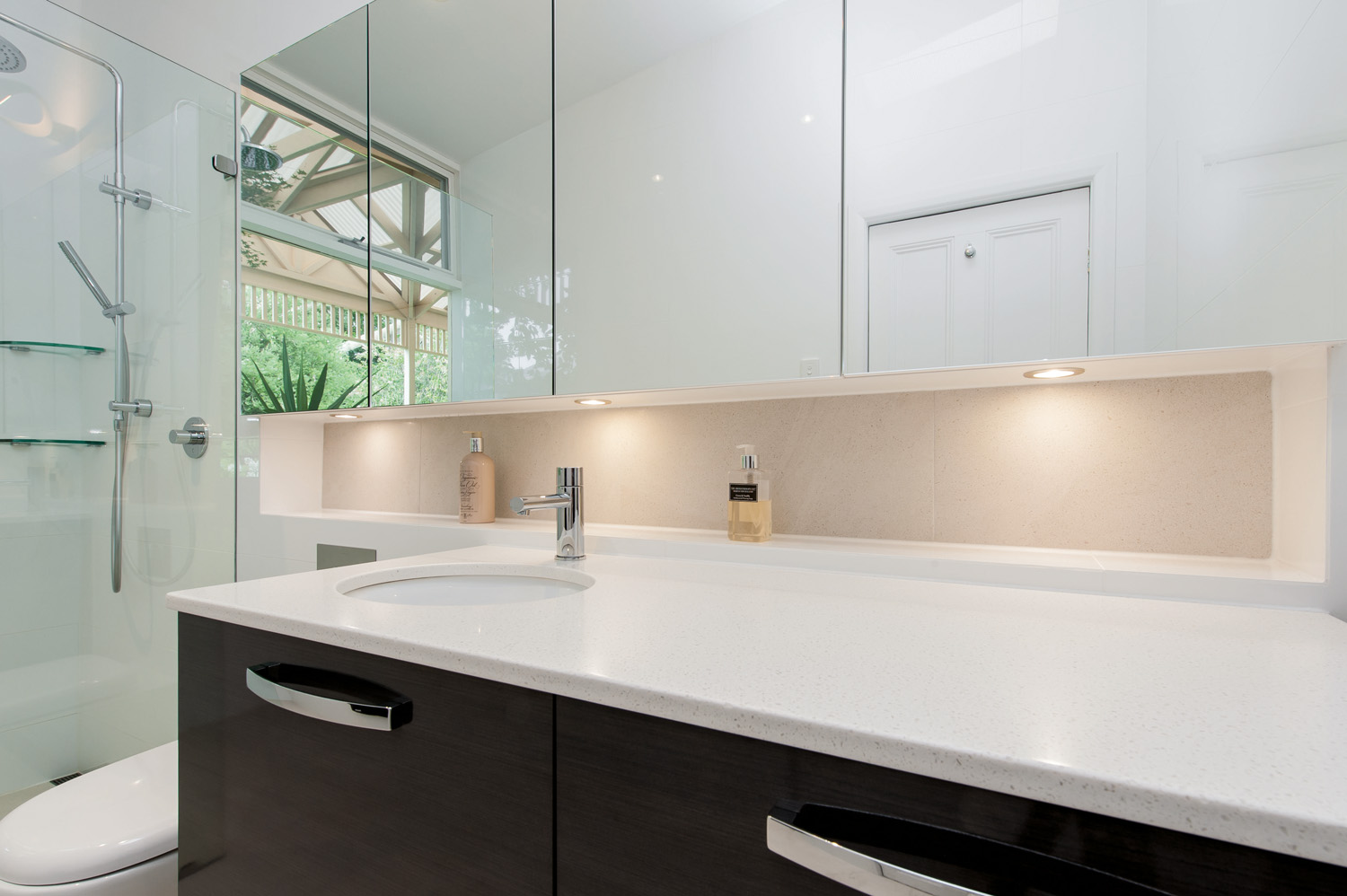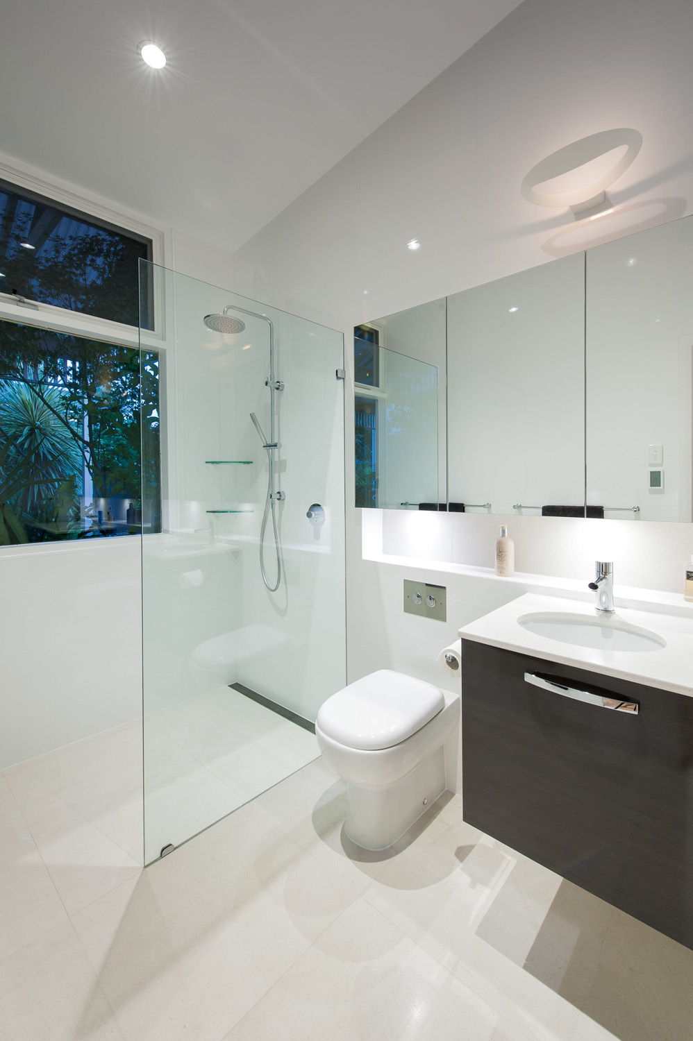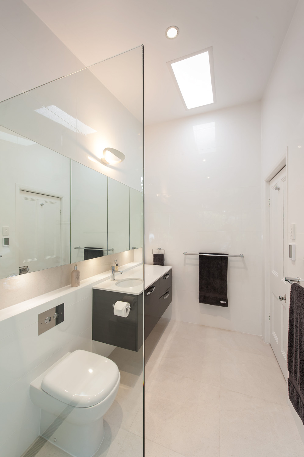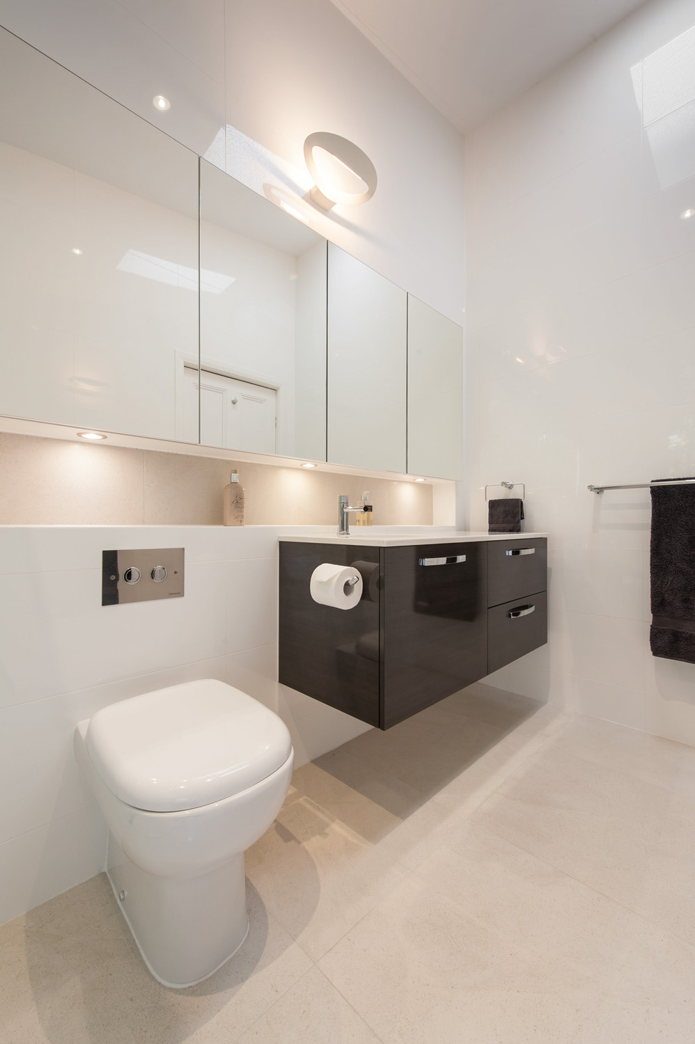 “Perfect lighting is the secret to this enchanting bathroom space. During the day, an open shower overlooks the beautiful garden, immediately creating the feeling of light and space. When night falls, feature lighting conjures an inviting, romantic ambience. We chose large-scale polished wall and floor tiles to visually expand the room, with a neutral palette presenting a clean-lined, sophisticated look. Adding more reflected light, a recessed mirrored cabinet stretches beyond the vanity and over the toilet to provide storage without taking up valuable space. Minimalist accessories complete the look.”
