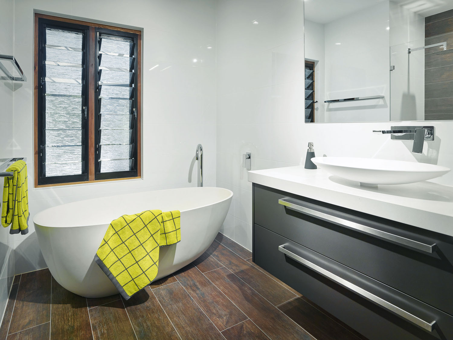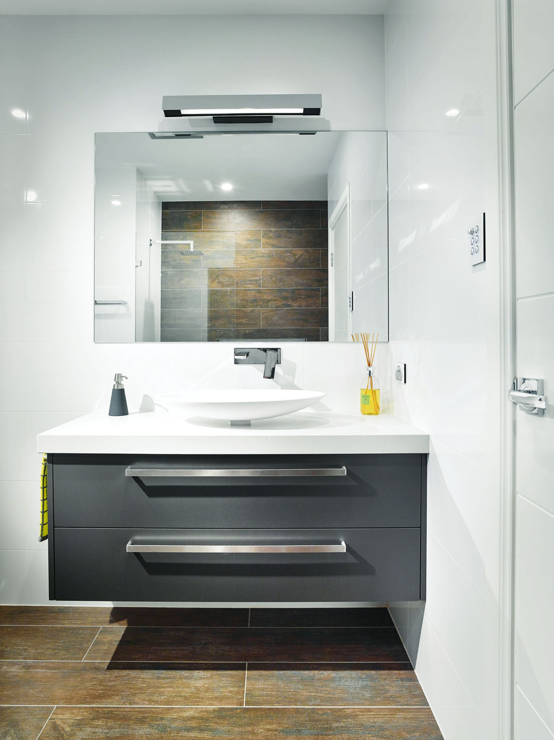Designed with a sophisticated sanctuary in mind, this Bathrooms & Kitchens SA space makes use of pared-back features and sparkling white tiles to enhance a sense of airiness, while the timber-grain floor injects an element of warmth and welcoming. Originally a modest bathroom with a separate toilet, this renovation has blended the two rooms together, maximising floor space and allowing the addition of a shower and bathtub. The freestanding tub adds a touch of luxury, marking this wet zone as a corner for pure indulgence. The louvered windows take full advantage of natural light but don’t compromise on privacy thanks to the frosted glass, allowing the owners an uninterrupted view of the garden. Stainless-steel and a sleek stone basin create a striking vanity, with an elongated mirror amplifying natural light and playing with the room’s dimensions. A frameless shower screen effortlessly blends into the rest of the room, with the barely-there design extending that clean and uncrowded feel.