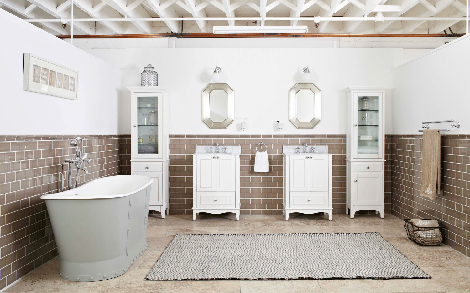 This bathroom, from Schots Home Emporium, oozes old-world charm and yet still has that much sought after modern edge thanks to the seamless flooring and crisp white walls
