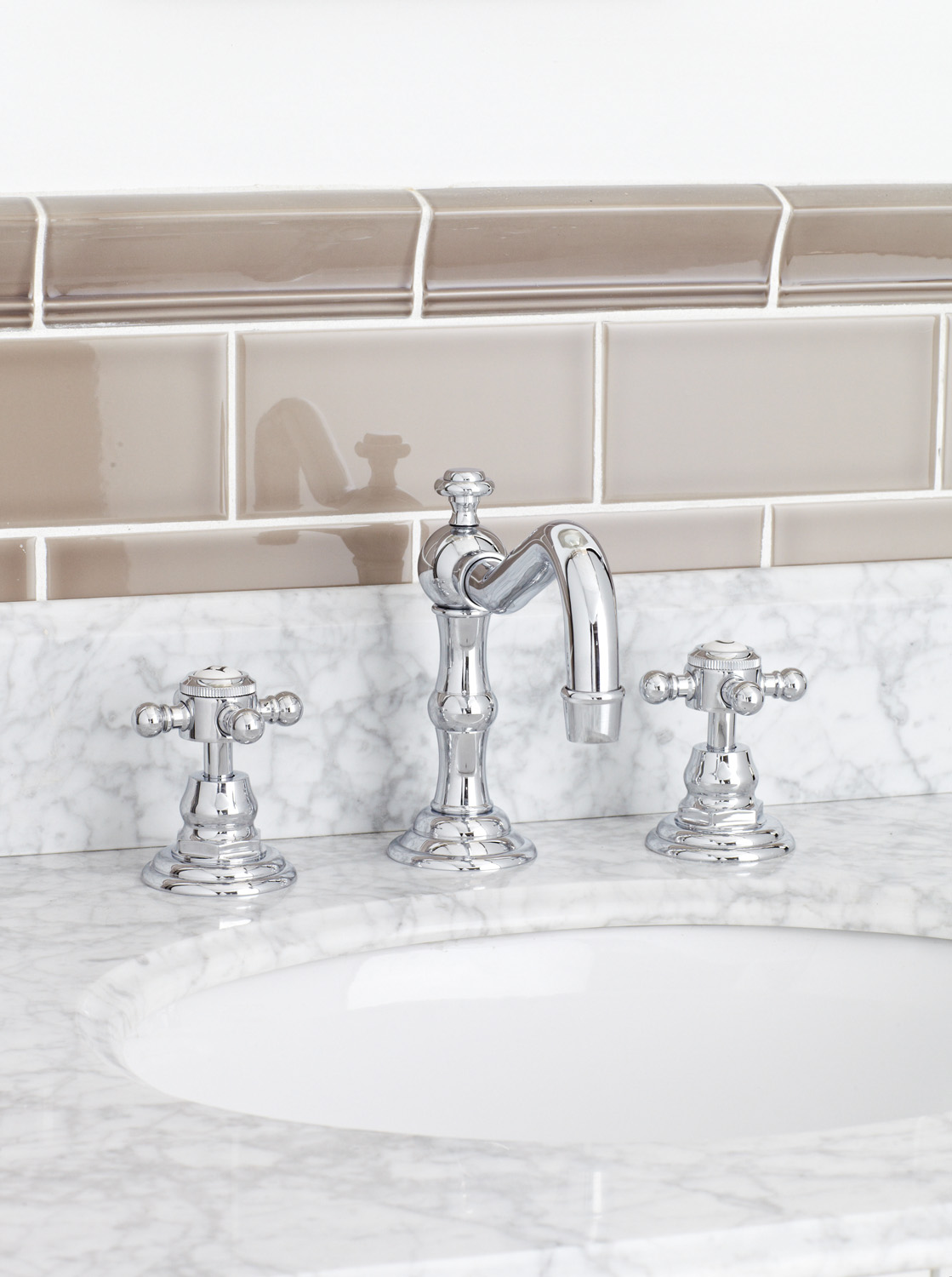 “Whether you’re renovating a home from the Victorian, Federation or Californian Bungalow eras, or even a lovely old country residence, an authentic old-world bathroom can become one of the best rooms in the house. The marble-topped period furniture with detail and glass doors, together with the butcher’s-shop-style tiles with capping, are signature features of a look that spells old-world charm. In this case, the grey rivet cast-iron bathtub adds a rustic industrial feel, perfectly complemented by the hand-beaten antique silver mirror. The design is given a modern edge thanks to the large seamless Villa travertine floor tiles and crisp white walls.”
