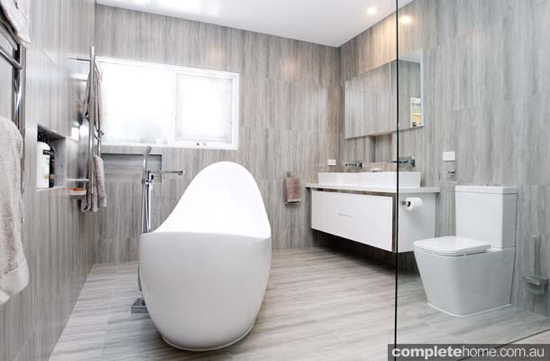 “This master bathroom and ensuite renovation is the perfect example of contemporary style that invokes a sense of relaxation and harmony. The two bathrooms are coordinated in the same gorgeous colour scheme of neutral tones with white finishes and accessories. The colour coordination creates balance and symmetry and is a soothing and calming palette.