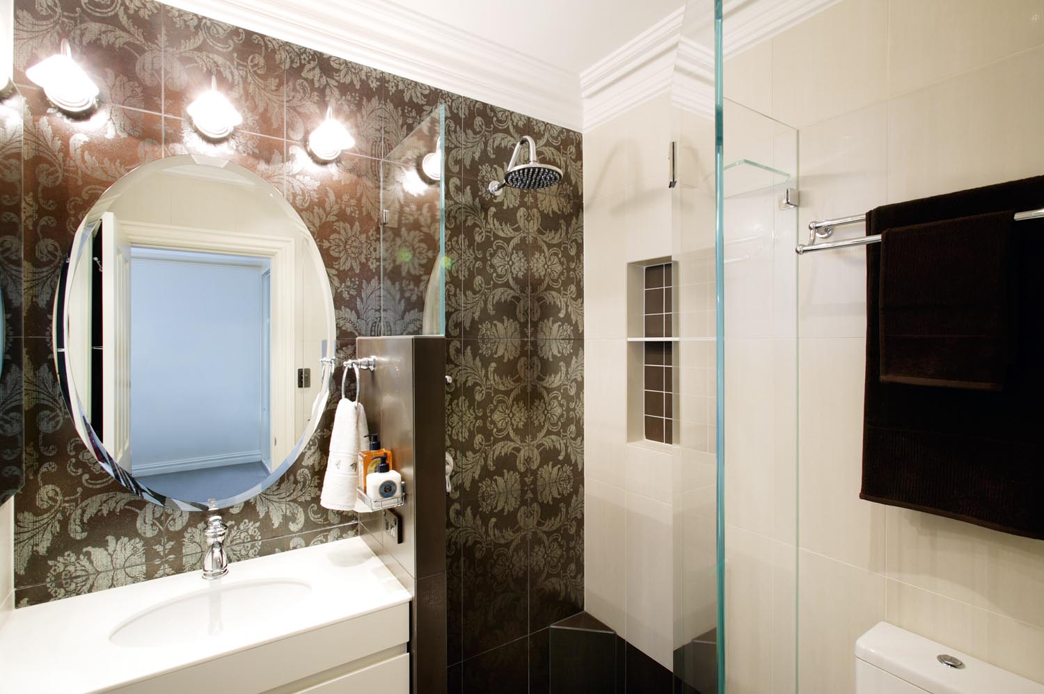 The rounded mirror and three frosted conical spotlights above the vanity complete the designer look, adding to this bathroom’s star quality.”