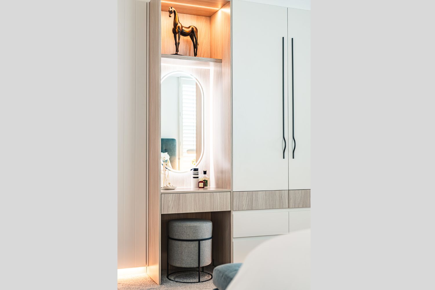 Connectivity between the bedroom and ensuite remains, but a narrower pocket door now replaces the original 1500mm slider to the living zone, improving acoustic privacy and contributing to the suite’s tranquil atmosphere. Every element is carefully considered, from storage to lighting and finishes, ensuring the space feels both practical and luxurious.
