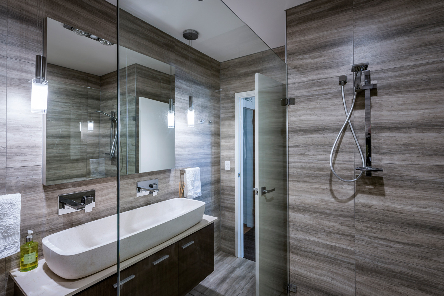 The shower and toilet suite have their own separate section complete with basin and storage options, while the elongated mirror artfully bounces the natural light around the room. Plenty of storage prevents clutter, and the hard-wearing materials are not only beautiful to look at but also easy to clean.”