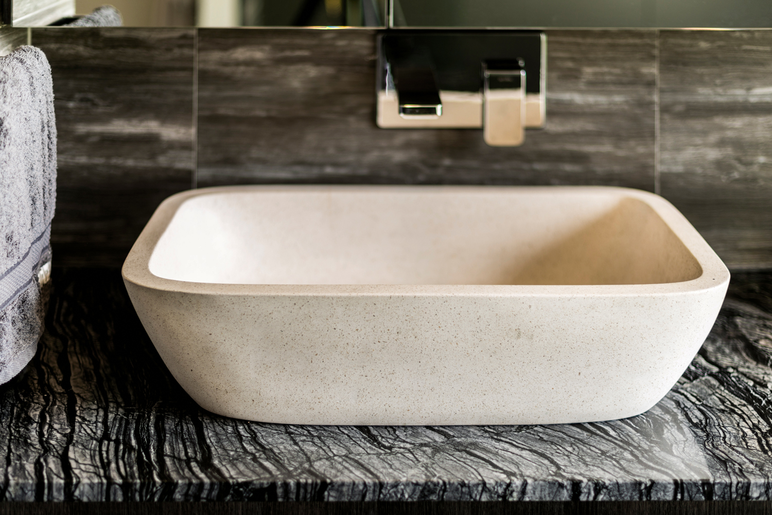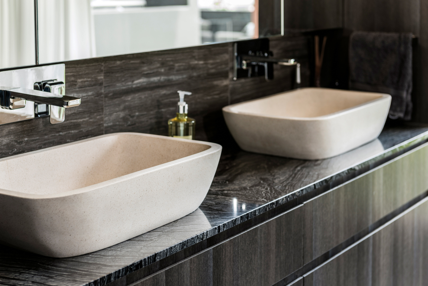 The standout element of this beautiful bathroom is the subtle, organic textures used to highlight the stone basins and bathtub