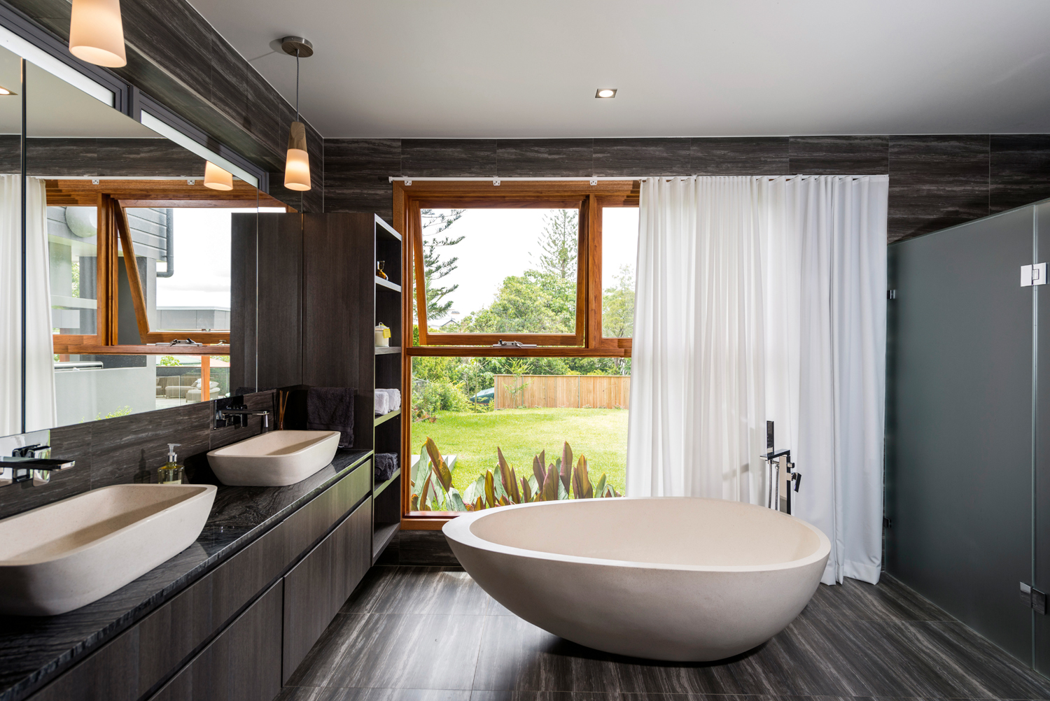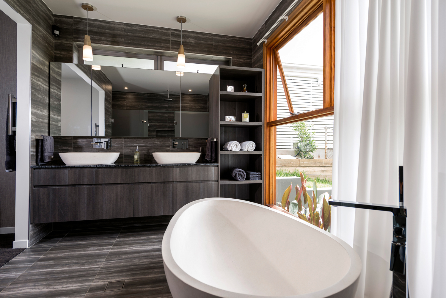 “When it came to this design, less was more — clean lines and a colour palette of rich greys let the garden vista do all the talking. Instantly creating a sense of soothing calm, the combination of the grained marble tiling and chic pristine white of the bathtub and basins is reminiscent of a luxury spa, while the timber-framed windows give this design a stylish and contemporary edge.