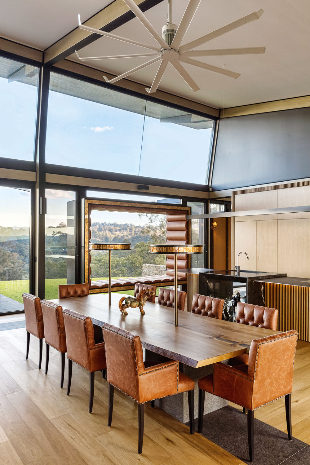 When you’re graced with picturesque views over the Glasshouse Mountains and surrounded by 200 acres, it’s only fair to create a home that rivals such natural beauty. From the outside, this residence may look like a simple cattle farmhouse, but first impressions are often misleading, which is crystal clear when you enter this award-winning lodge created by Mark Gacesa of Ultraspace and Stewart Homes.