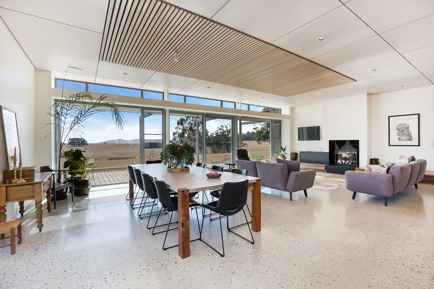 Featuring an interior rammed earth wall, nail strip cladding and polished concrete flooring, the natural colour palette of this modern farmhouse perfectly suits the stunning rural surrounds. An open plan kitchen, dining and living area is the heart of the home, with compartmentalised living zones for private areas.