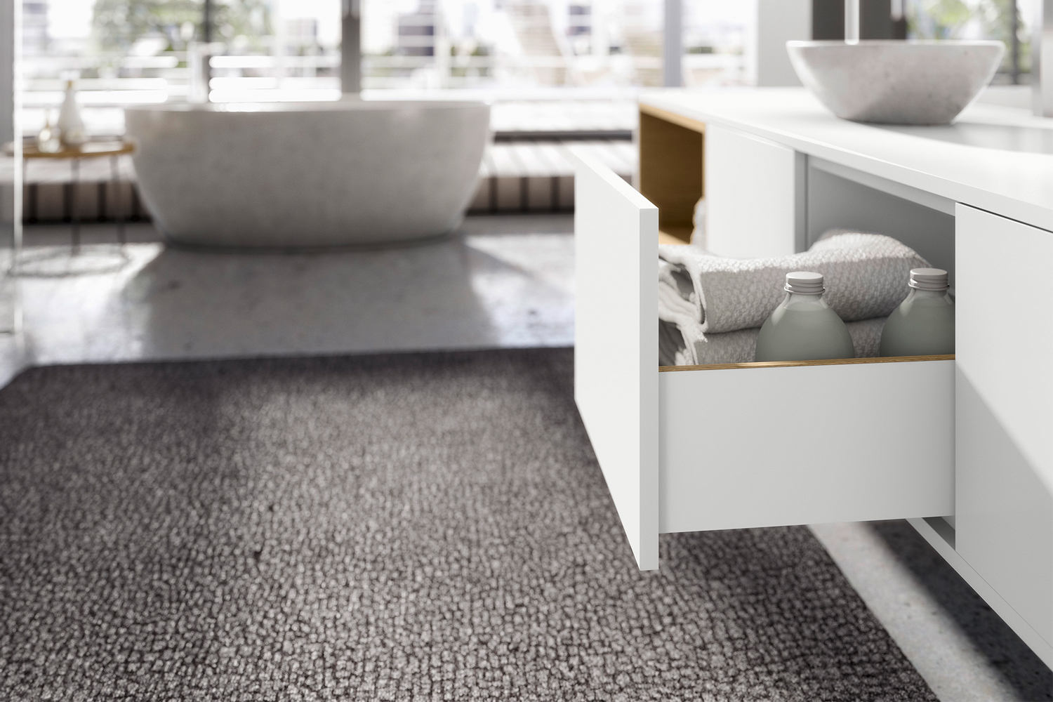 The concept provides a huge amount of design flexibility in terms of colour, shape and material, giving you the key to successfully turning your own furniture design ideas into reality. In a width of only 13mm, the style is uncompromisingly sleek. Where working components innovatively vanish into the slender drawer side, the clean design is set off with stunning effect. Here, there are no cover caps or holes to spoil the look of flawless beauty. The fitting deliberately recedes into the background and blends in with furniture as a design element.