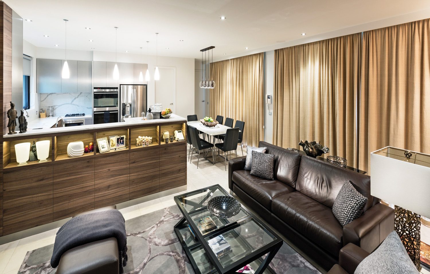 The formal dining is steps away from the kitchen, which offers plenty of room for friends and family to enjoy meals together. Within the lounge and formal dining spaces, a mostly neutral palette is used, with metallic accents adding glamour. “The formal dining and lounge rooms are bracketed between the elegant neutral and metallic elements of the Real Flame fireplace, Eiffel coffee table, silk drapes and oval chrome pendant studded with crystals,”