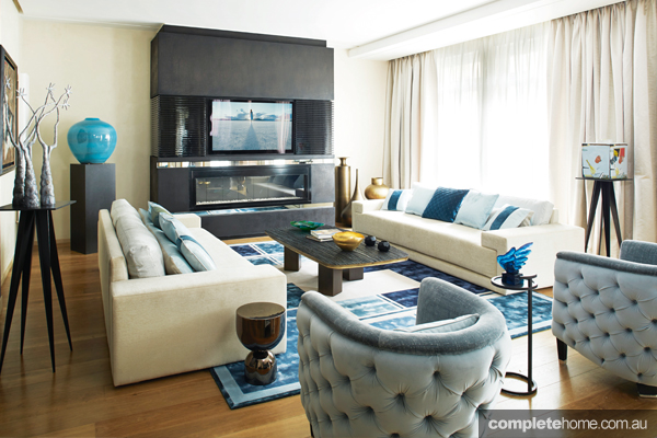 A generosity with lavish materials extends into the living and formal dining area. Here, plush carpets, velvet sofas, leather panelling, deep-buttoned armchairs and a mix of metallic and matte finishes create a sumptuous, textured environment. A humble muse lies behind this grand space. “The inspiration was a light-blue colour my client had liked,” Coutas mentions. This vibrant cerulean ripples throughout the room, a unifying thread that enlivens and complements the gentle taupe and mocha palette. From the scattering of this colour to the furniture arrangement, there’s an alluring sense of symmetry to this room. Many of the pieces were designed by Coutas herself, including the robust dining table, minimalist pendant lights and oversized mirrors on the far wall. Ever the devotee of true craftsmanship, her sensitivity to scale and detail in a room are revealed by these furnishings.