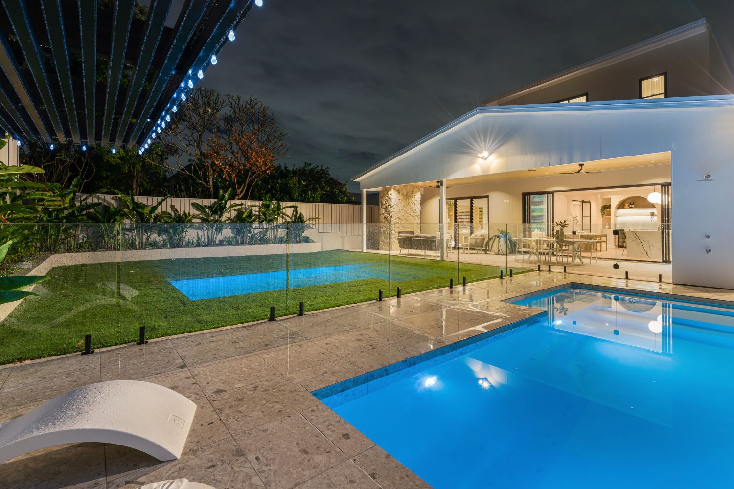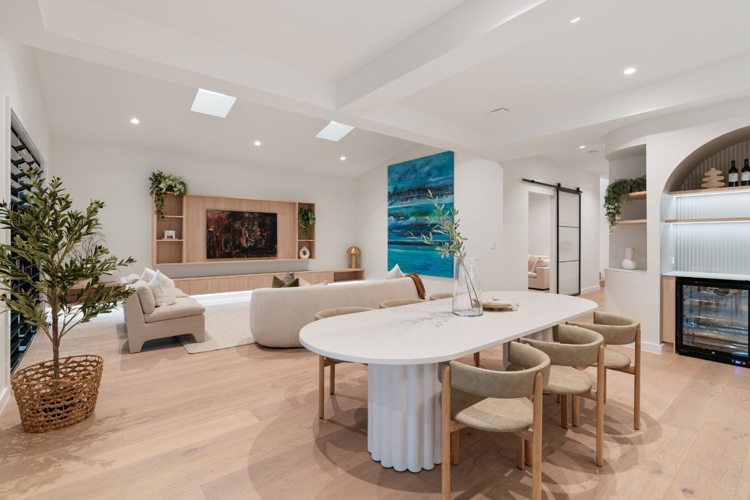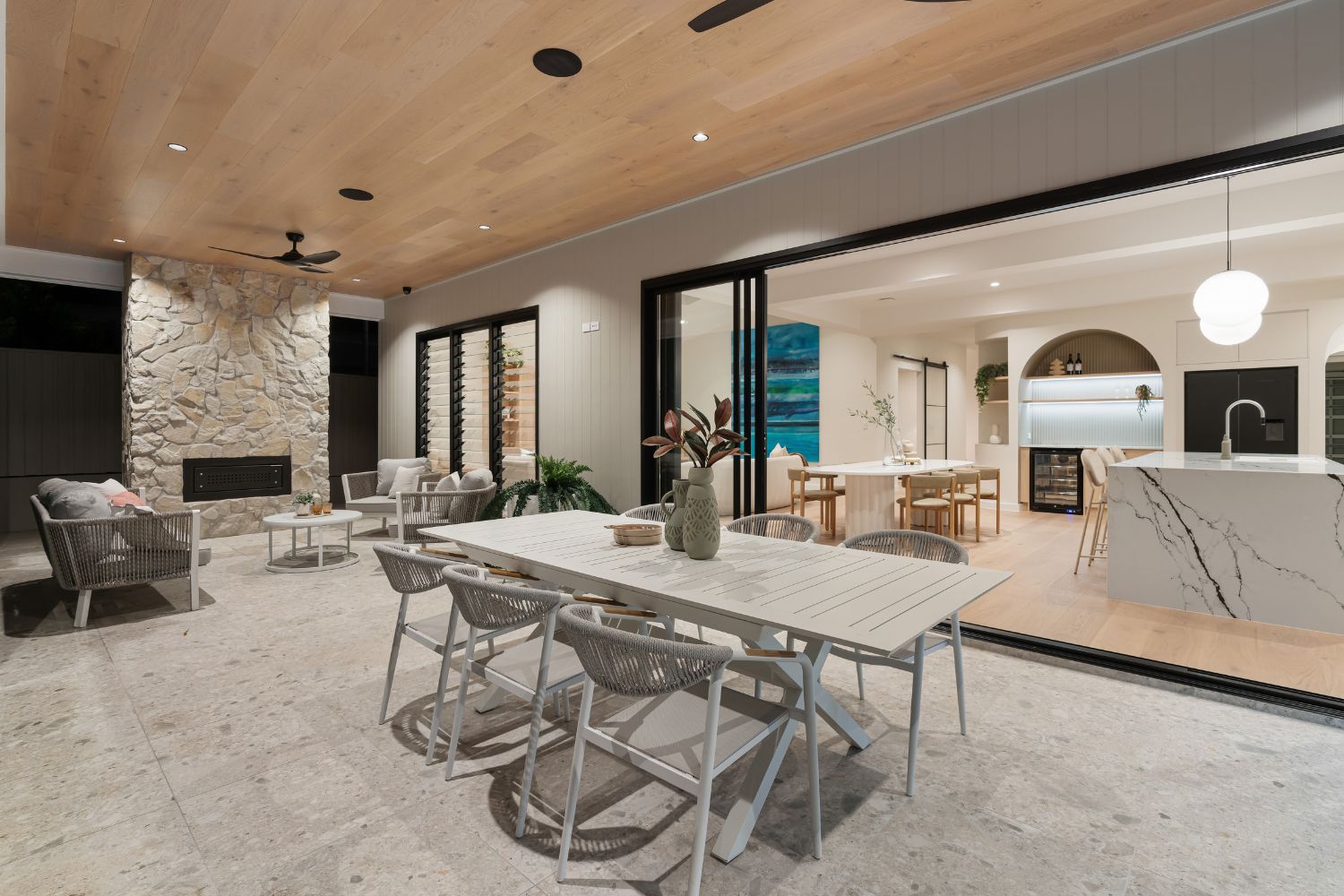 Within the dining and living space, timber-panelled storage harmonises with marble benchtops, seamlessly merging functionality with aesthetics. An open dining area, subtly sectioned off by privacy walls, adds a sense of intimacy to the expansive design, whilst comfortably including a ten-seat dining table. The living space provides plenty of room for family fun and is positioned with direct access to the outdoor kitchen, dining and entertainment area.