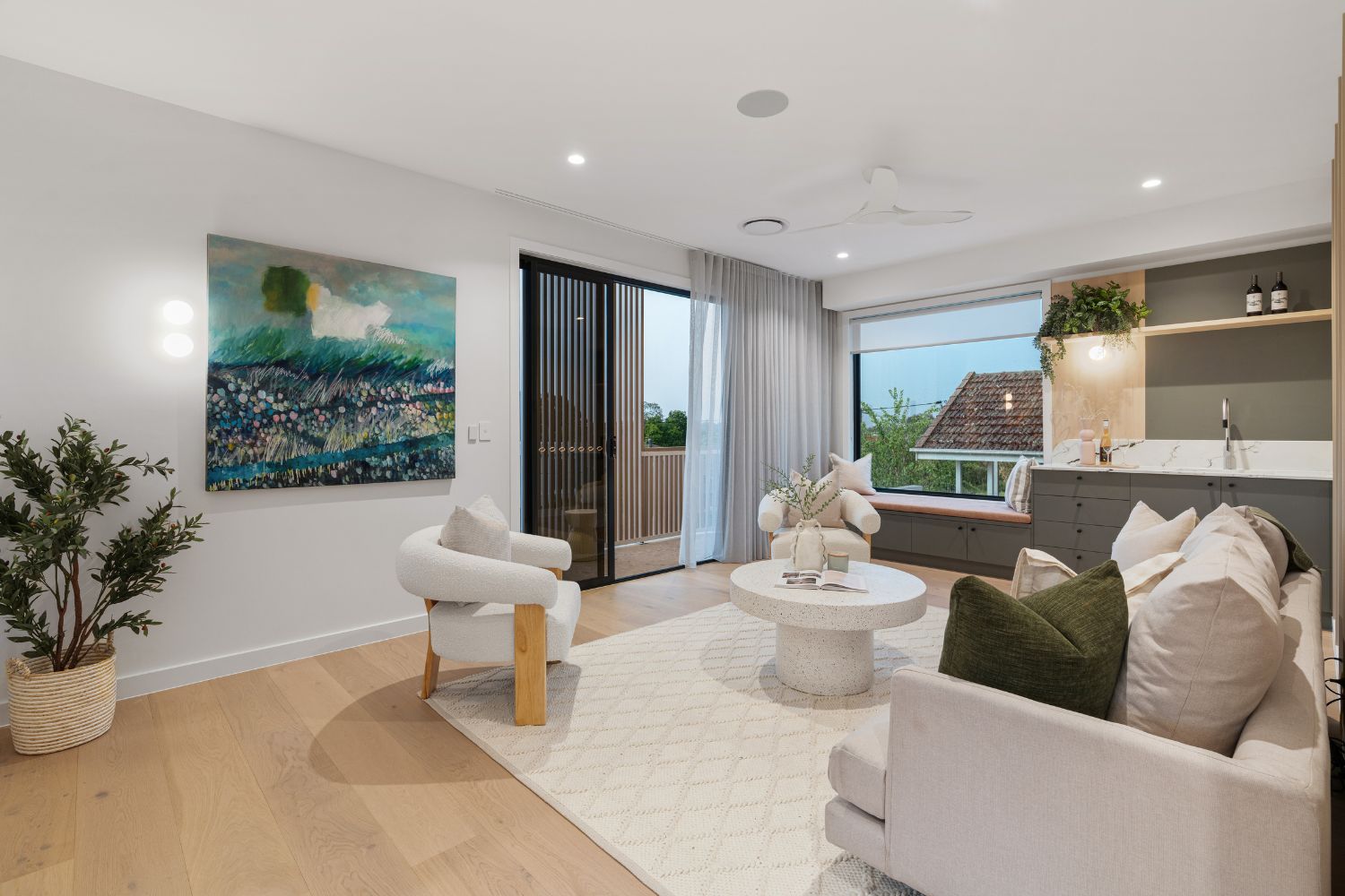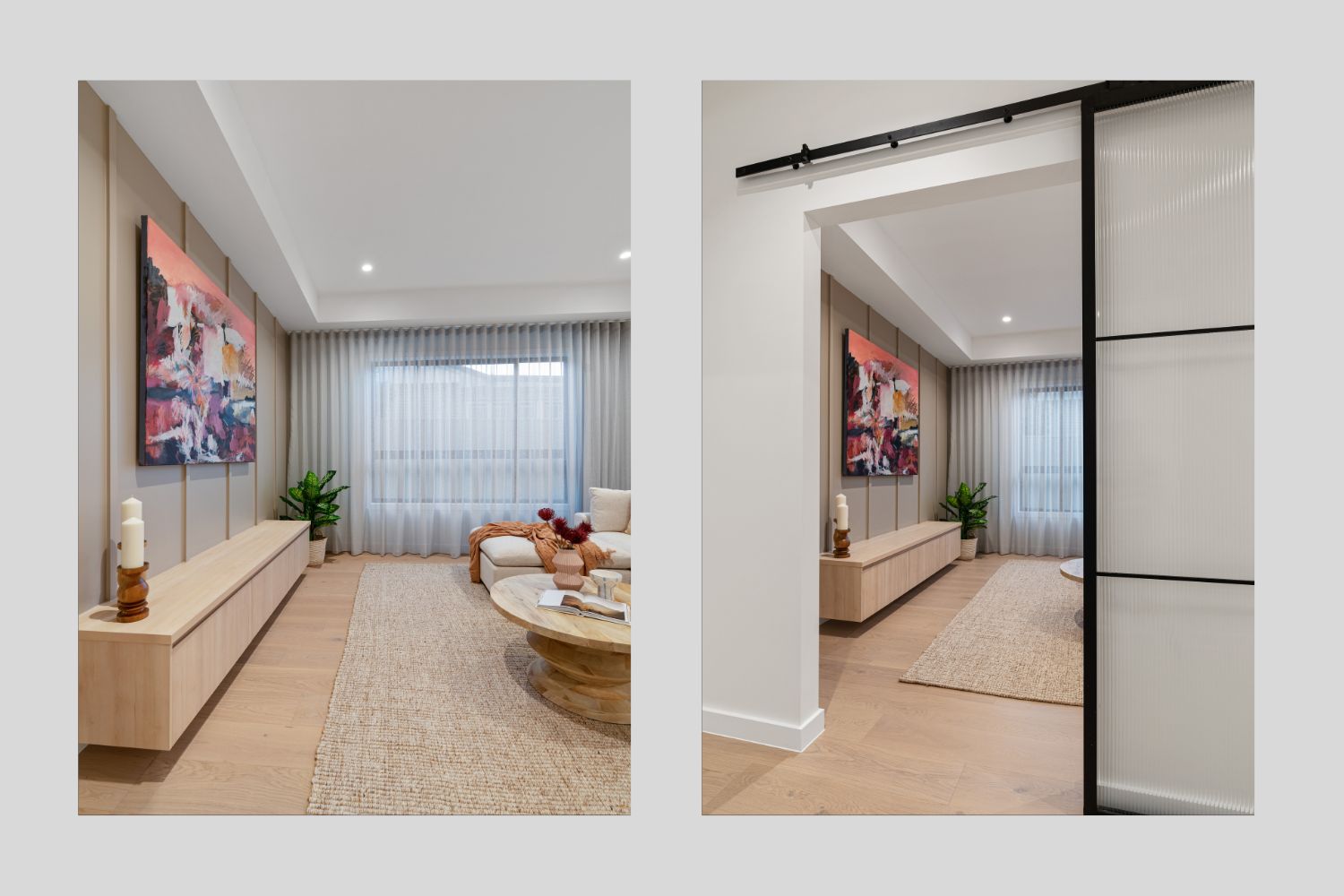 Dark timber flooring flows throughout the property, contrasting beautifully with the crisp white interiors. From the wide entry hall, occupants access a series of private spaces including the home office and informal dining and lounge. A concealed sliding door within the hallway provides delineation from these private areas to the shared open plan zone, whilst minimising sound intrusion.