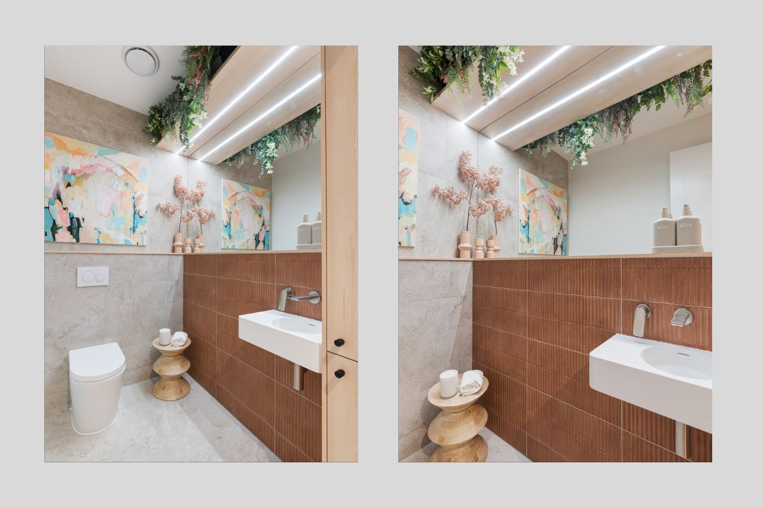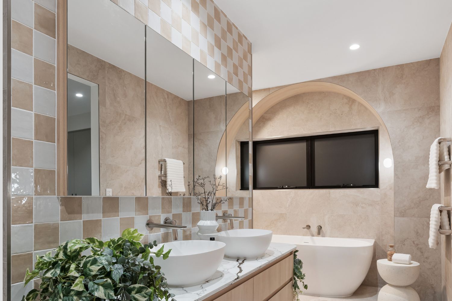 Blackbutt timber boards line the bathrooms, complemented by Fibonacci’s ‘freckle’ terrazzo floor tiles which are dappled with timber-toned aggregate. Bronzed fixtures and timber cabinetry reinforce the natural, earthy feel.
