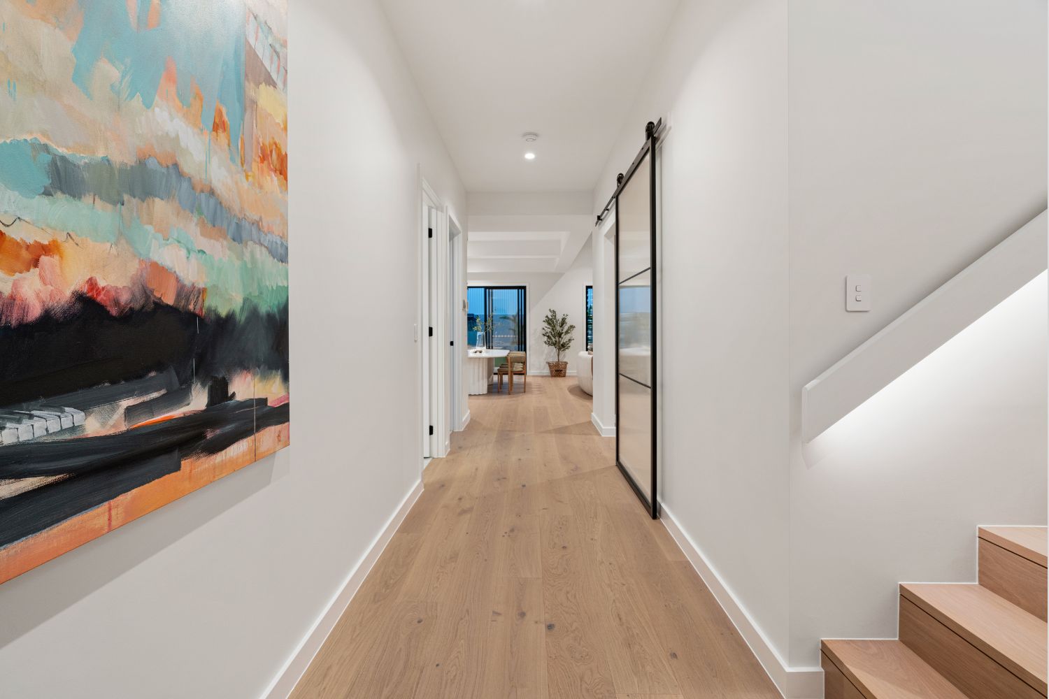 Upon entry visitors are greeted with expansive over height ceilings, making all the shared spaces throughout the property feel exceptionally large. Feature pendant lighting bathes the space in a golden hue, illuminating access to the steel and timber floating staircase, positioned against a grey feature wall.