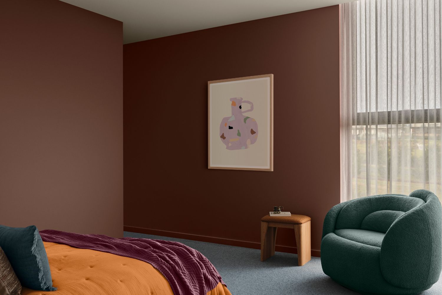 The second bedroom showcases the versatility of the Evoke palette with Dulux Baked Clay as a feature wall paired with Dulux Snowy Mountains Half. Velvet materials, dark timber tones and carefully curated décor work together with the walls to add richness, texture, depth and warmth to the space.