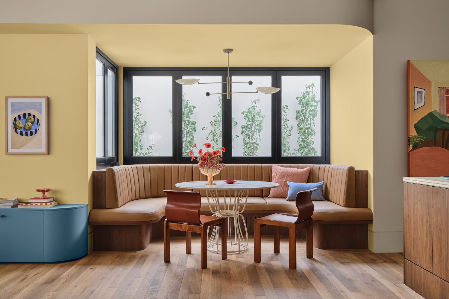 - Build from a soft base: Start with warm colours such as soft yellows, muted melon and warm mustard balanced with soft blues and chocolate. This calm foundation allows deeper accents – such as plums, reds and deep aqua – to add contrast and a cultured edge.