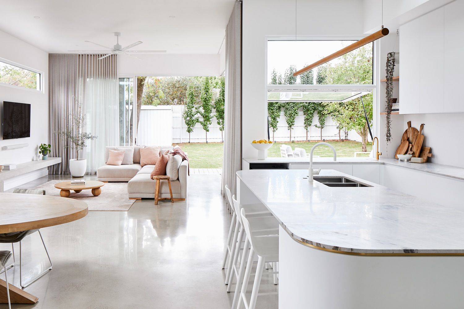 A white kitchen with feature stone island is complemented by engineered timber flooring in a light tone so as not to overshadow the space. embeltonflooring.com