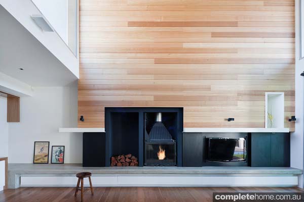 Raised hearth with a Radiant 843 Cheminées Philippe fire. Photography by Shannon McGrath and architecture by Rachcoff Vella Architecture. chemphilaust.com.au
