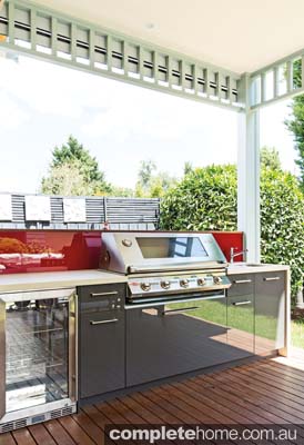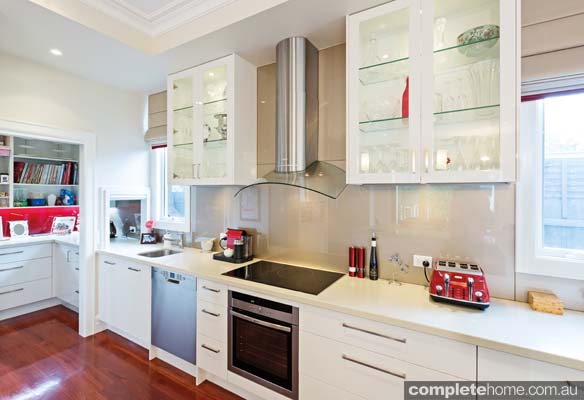 The ultra-bright white of the drawers and glass cabinetry generates the effect of airy spaciousness, while the splashes of red seen at the base of the island and various appliances, together with the sandy splashback and highly polished Jarrah flooring, bring the kitchen back down to earth and provide a cheery warmth to greet visitors.”