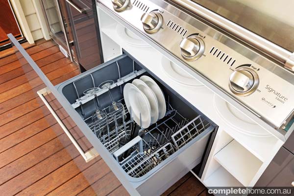 As a focal point of the design, the beautifully bold L-shaped island maximises bench space and defines the kitchen area, creating a welcoming place for guests. A wall of drawers and cabinets also adds to the storage capabilities of the kitchen.