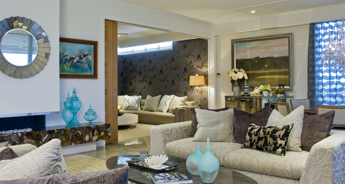 The dining sideboard is constructed from Venetian mirrored glass and above the dining setting, a beautiful chandelier allows slivers of light to dance around the room. The blue curtains blend with the tones of the Persian silk rug and an exquisite Arthur Boyd painting that hangs above the sideboard.