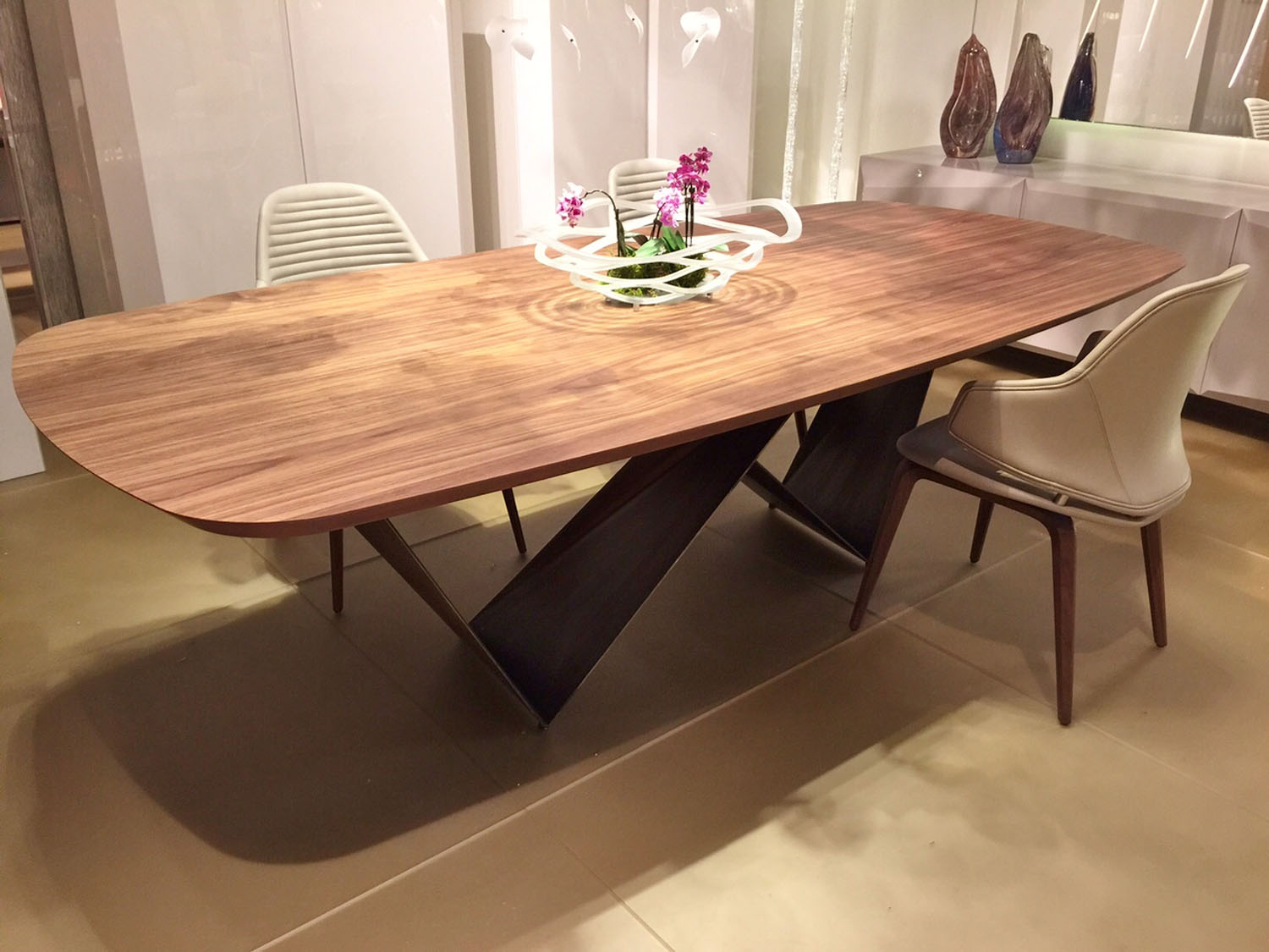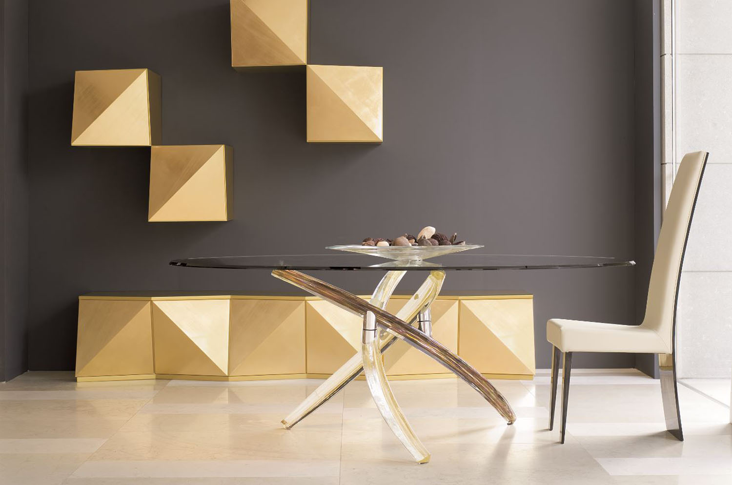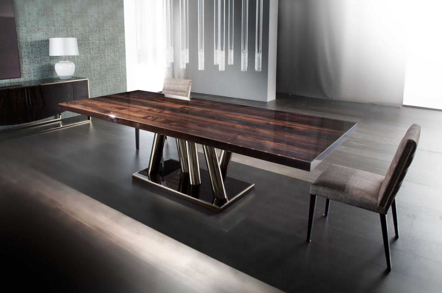 The Prizma Dining table is an elegant style fit for any home. With a stunning base made of up two metal elements in bronzed brass, this minimalistic table is available in rectangular or rounded rectangular. Also available is a 3D graphite steel base or chrome base.