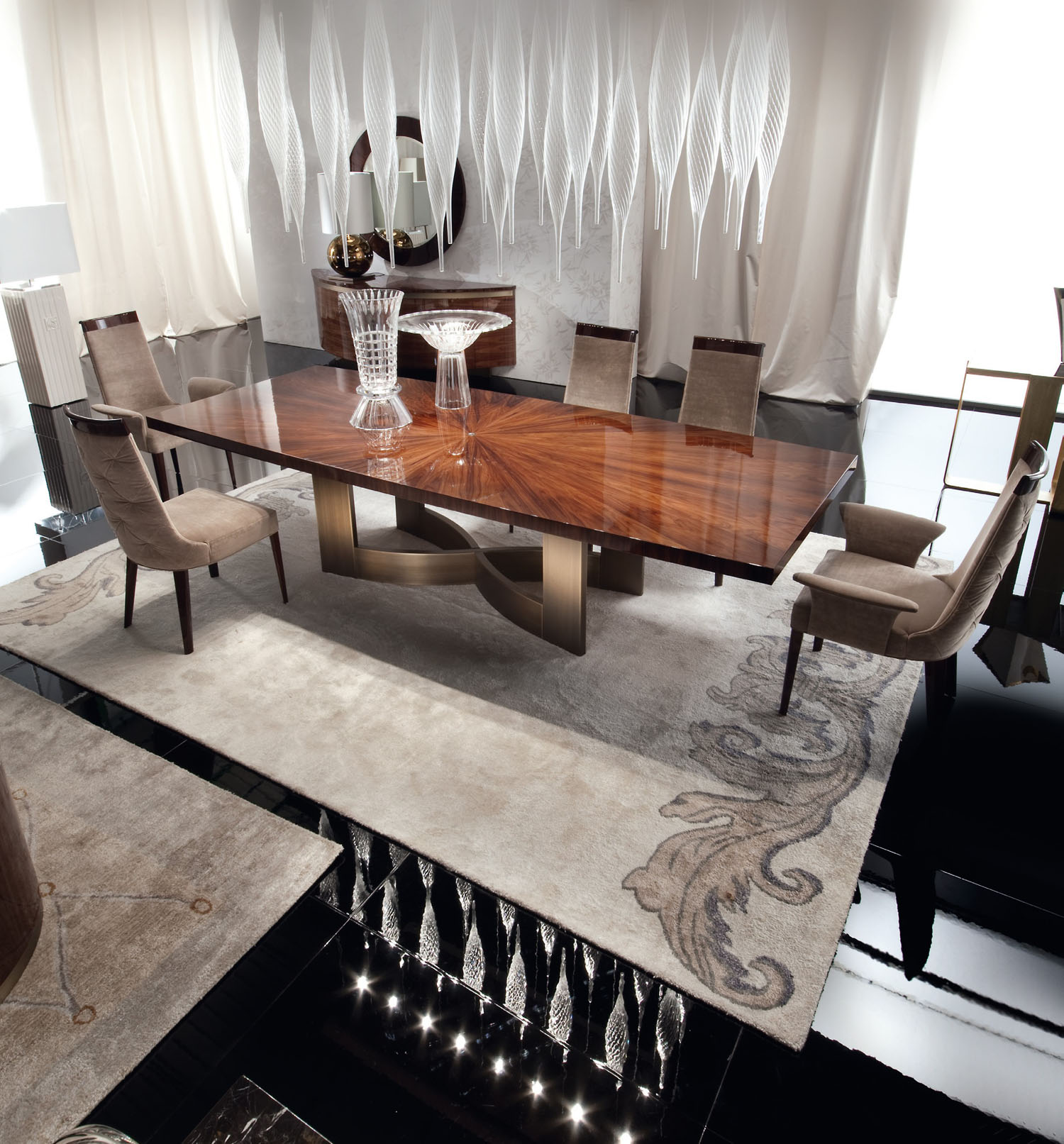Also part of the Coliseum Collection, the Coliseum Dining Suite is made from a rare species of Brazilian Rosewood timber and features a high gloss polyester finish with a sunburst centre top. The base is made from a brushed bronze stainless steel and the chairs are dressed in luxurious velour but are also available in a variety of Italian fabrics including first grade Italian leather.