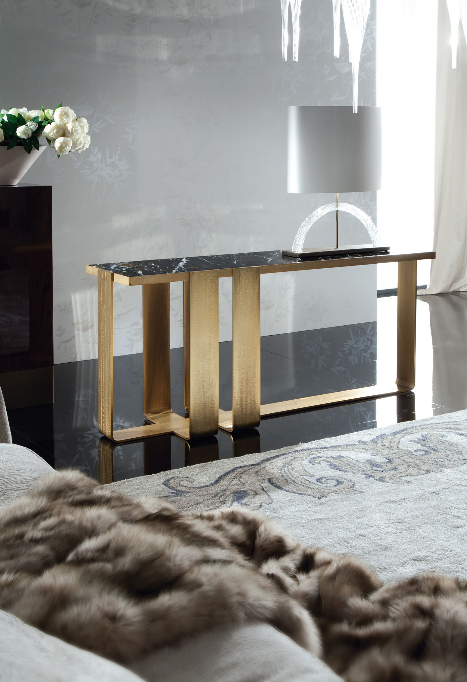 Part of Sovereign’s new Coliseum Collection, the Coliseum Console is a striking piece that has been skilfully crafted from solid stainless steel with a bronze effect application. The top is a stunning Madagascar black and gold marble.