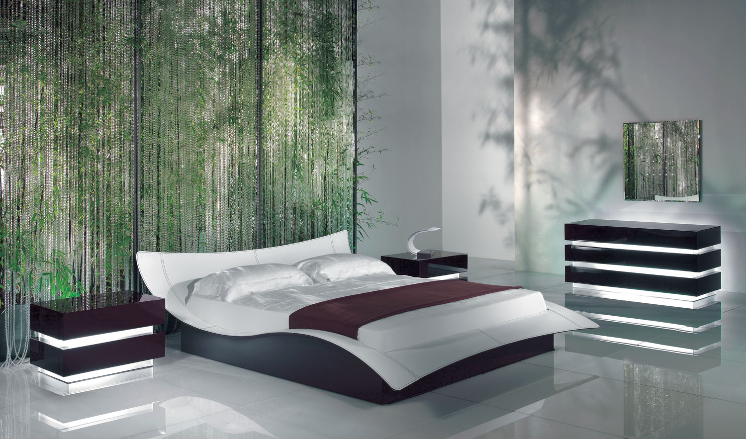 The Butterfly Bedroom Suite features a glamorous shaped bed made from first grade Italian leather and matte lacquered base. Optional storage unit and slat version are also available. The suite also includes stunning illuminated bedside tables and matching tall boy and dresser.