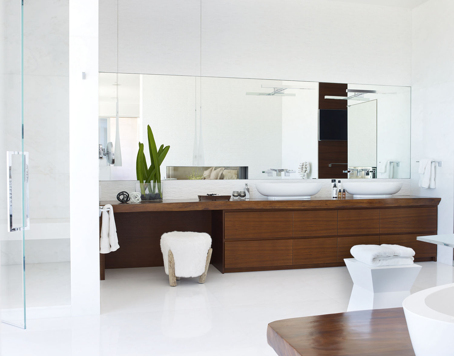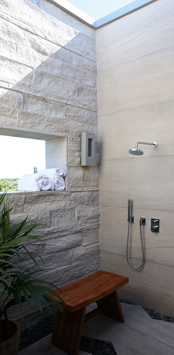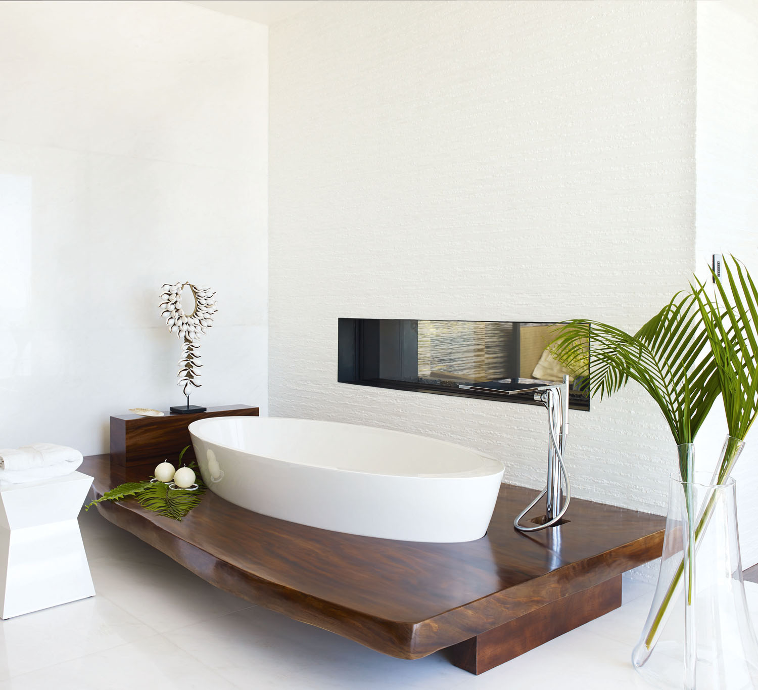 In some spaces, such as the master bathroom, sustainable timber such as suar (samanea saman) from Bali was used. This non-endangered, fast-growing tropical hardwood has a criss-cross, interlocking grain that reduces the risk of cracking due to temperature changes. It is particularly suitable for large sculptures and furniture made from slab material.