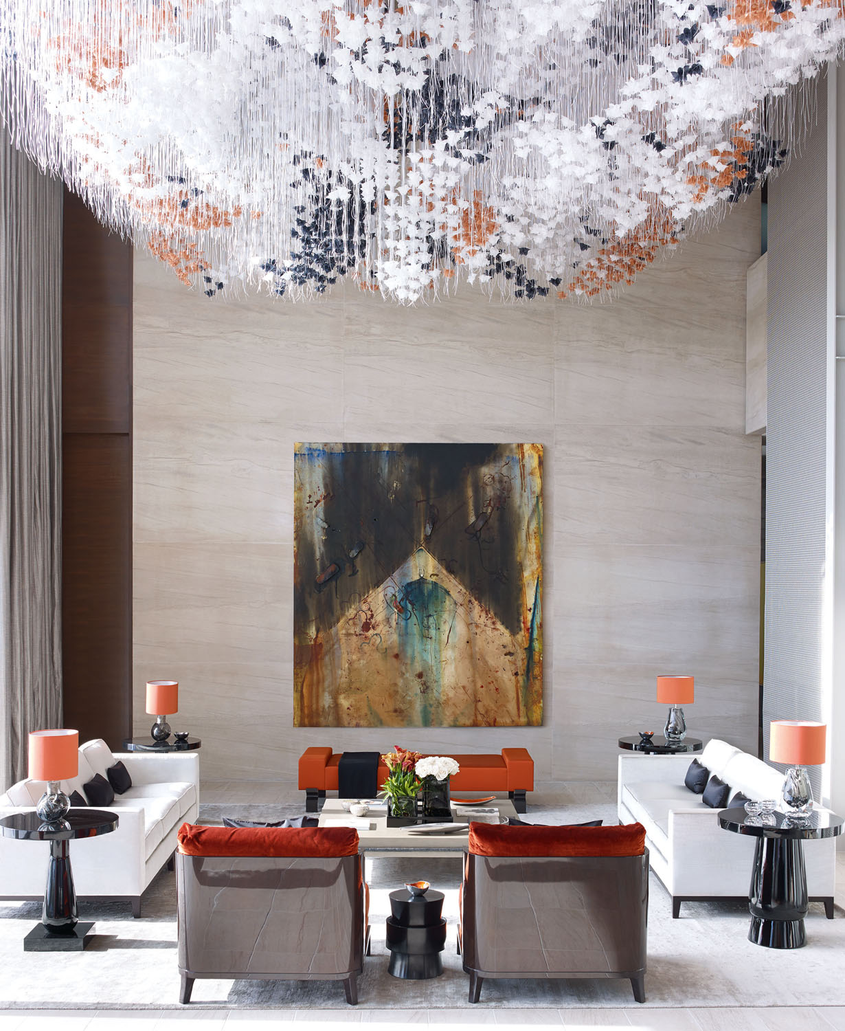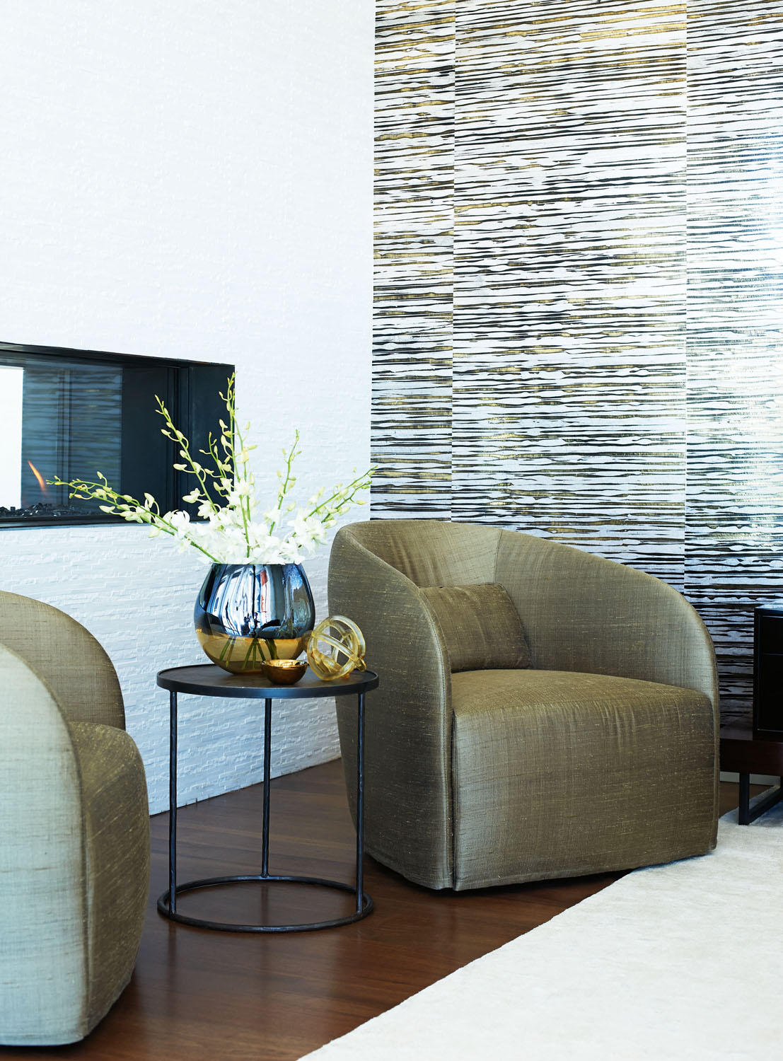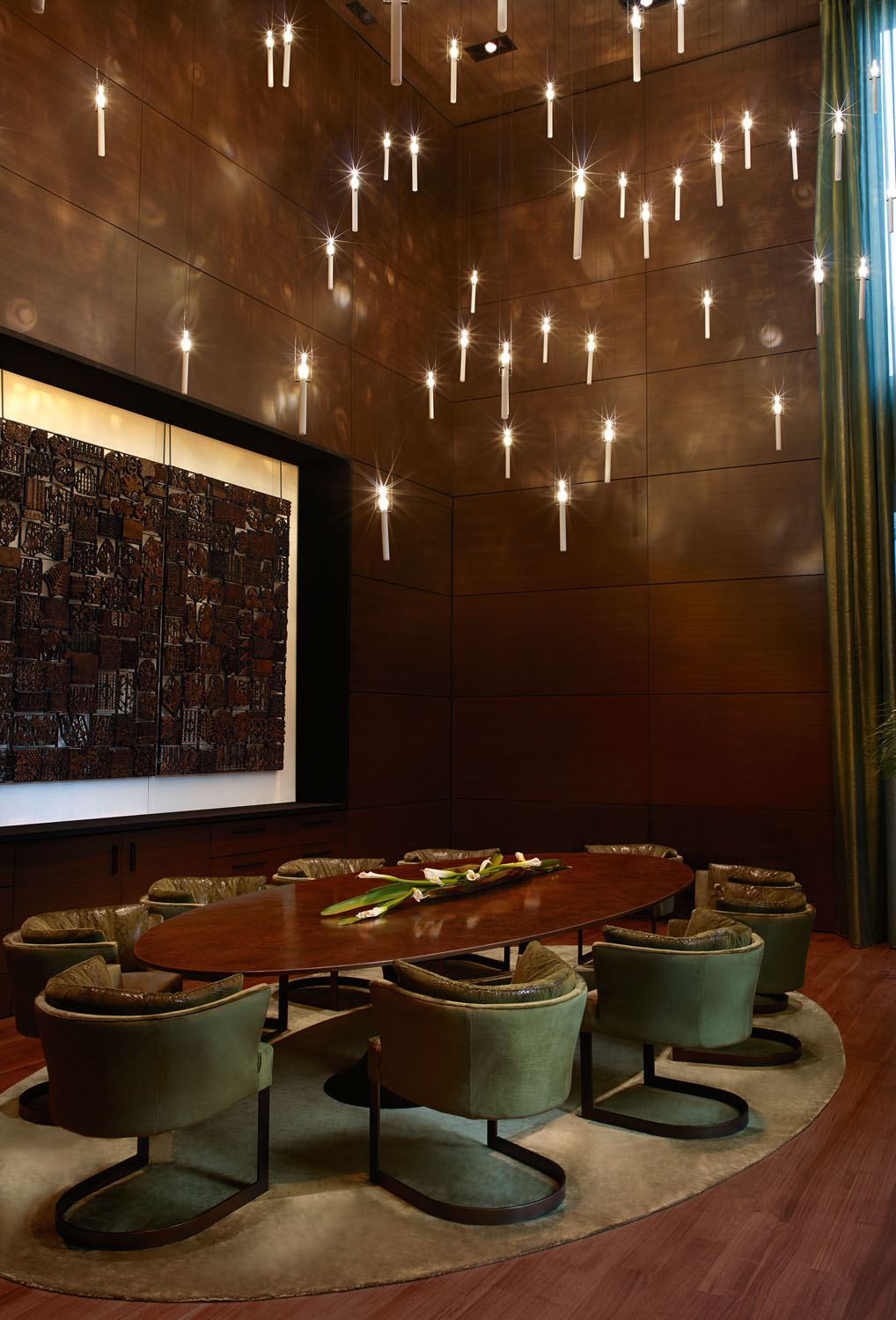 With Katherine’s brief in mind, Dorothee proposed interiors of contemporary elegance combined with international influences. This would be achieved by bringing together artfully applied custom lighting installations, textures, furniture sourced from around the world, finds from Katherine’s travels, vintage pieces and a variety of custom-designed furnishings.